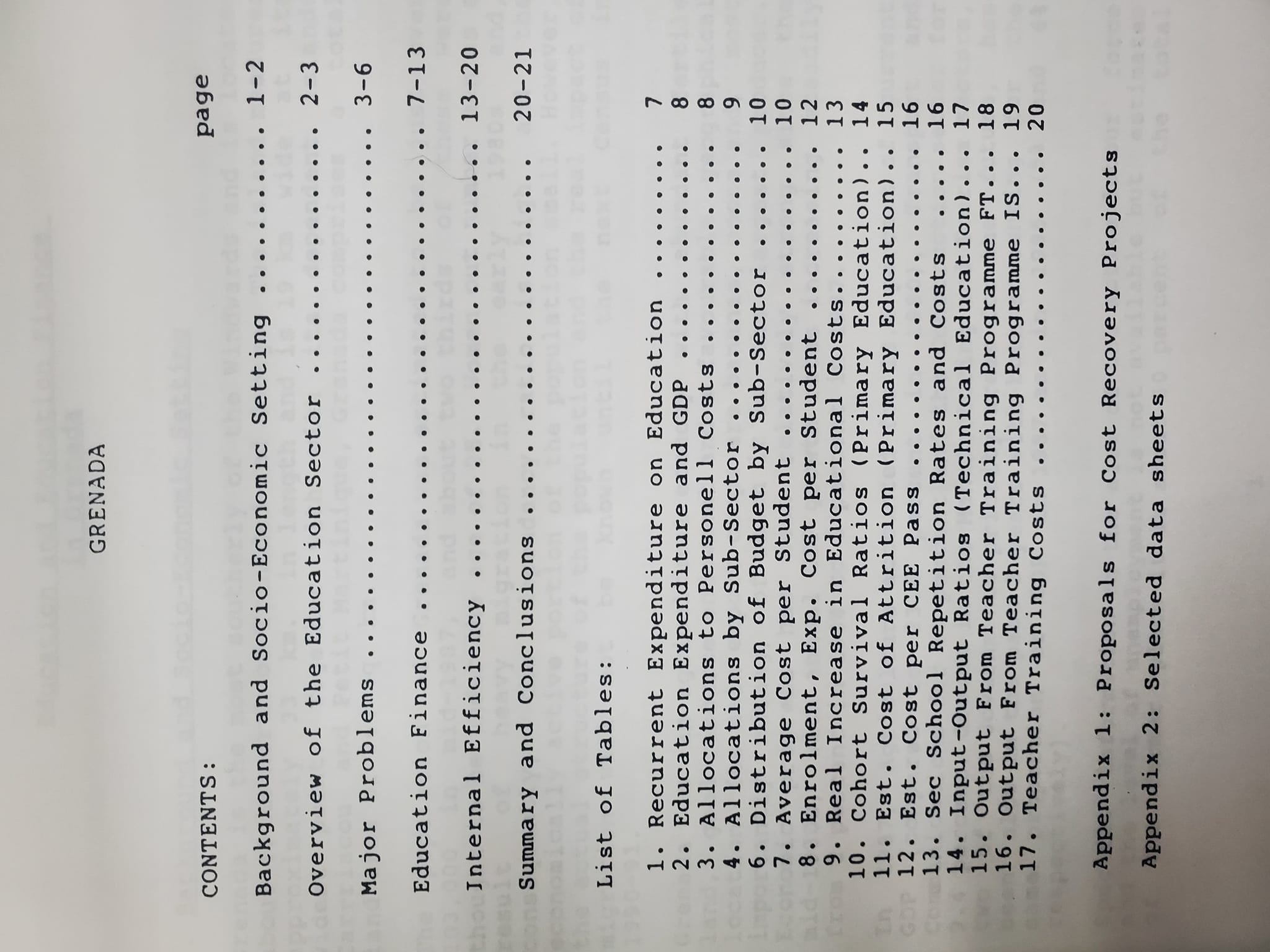 This examination of education I Grenada covers expenditure data as well as estimates. However, because of the restructuring of the Ministry of Education in 1988. Some of the individual expenditure categories were eliminated. Because of this, analysis of financial developments is often confined to the period 1984-1987. The analysis relates the level of government recurrent expenditure in the sector to total government spending and GDP indicators. It further examines average per student costs, and the relationship between enrolments and expenditure for the various levels and types of education. The analysis also identifies factors related to the cost-effectiveness of educational provision in the country.