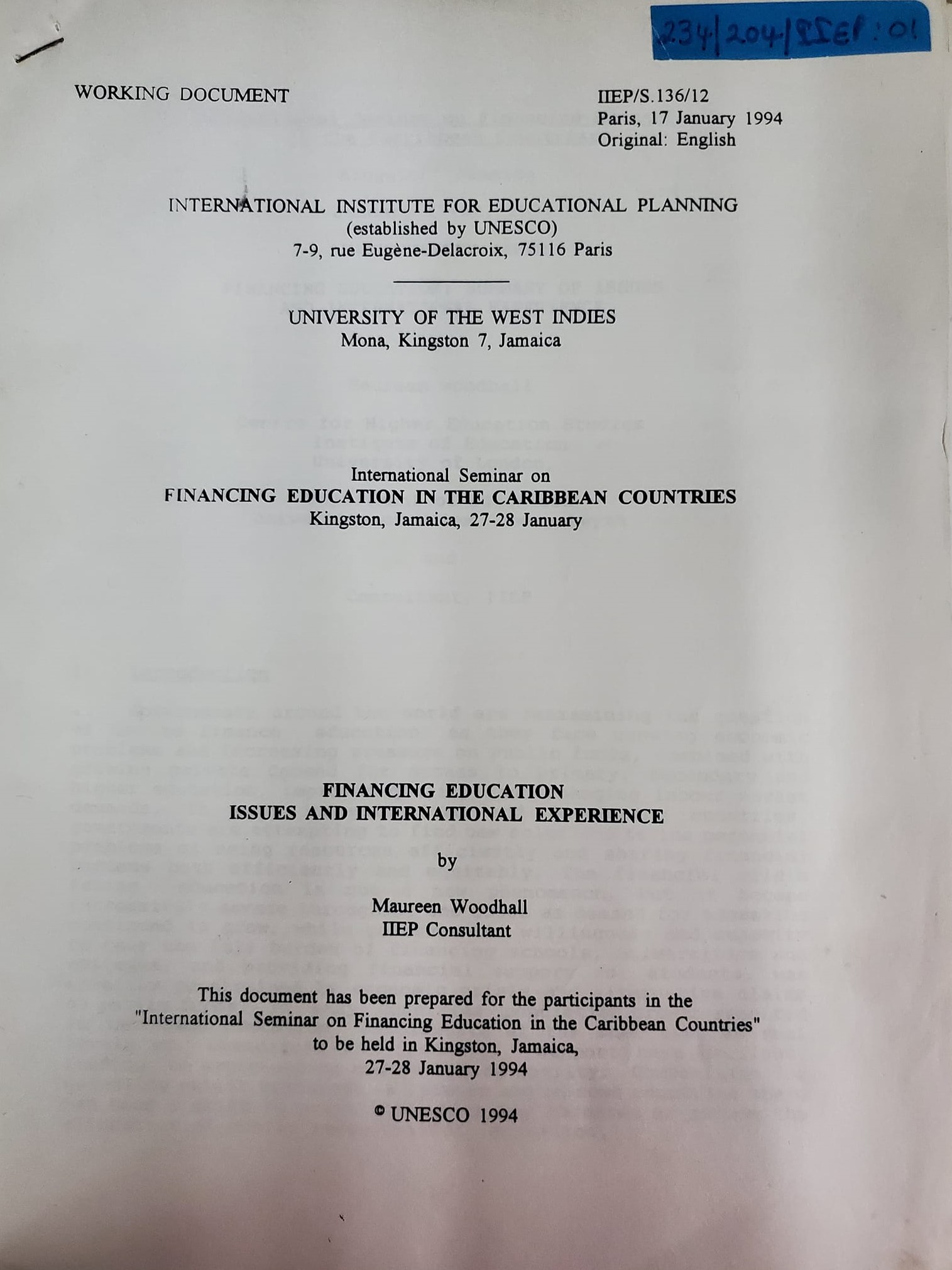 This document has been prepared for the participants in the “International Seminar on Financing Education in the Caribbean Countries” to be held in Kingston, Jamaica, 27-28 January, 1994