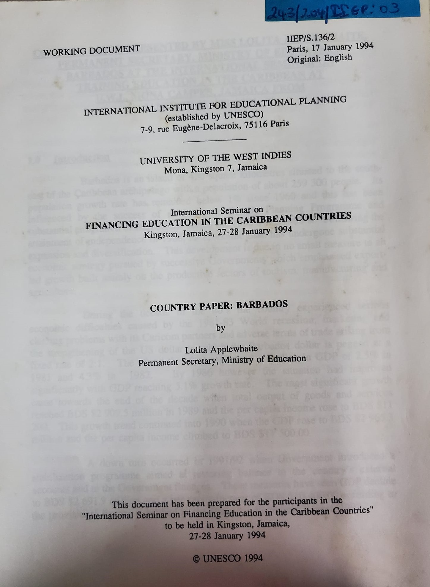This document was been prepared for the participants in the “International Seminar on Financing Education in the Caribbean Countries” held in Kingston, Jamaica, 27-28 January, 1994