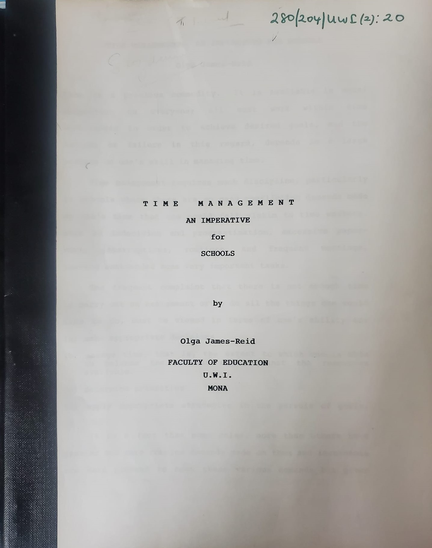 This paper reports on a preliminary study on time management in 22 primary and all-age schools in Jamaica. Data were collected from observation of teachers at work in seven classrooms, and from a questionnaire administered to teachers from 15 schools. Results of the analysis showed, among other findings, that school time is not adequately used by teachers with instructional time being seriously affected by non-instructional time or activities.