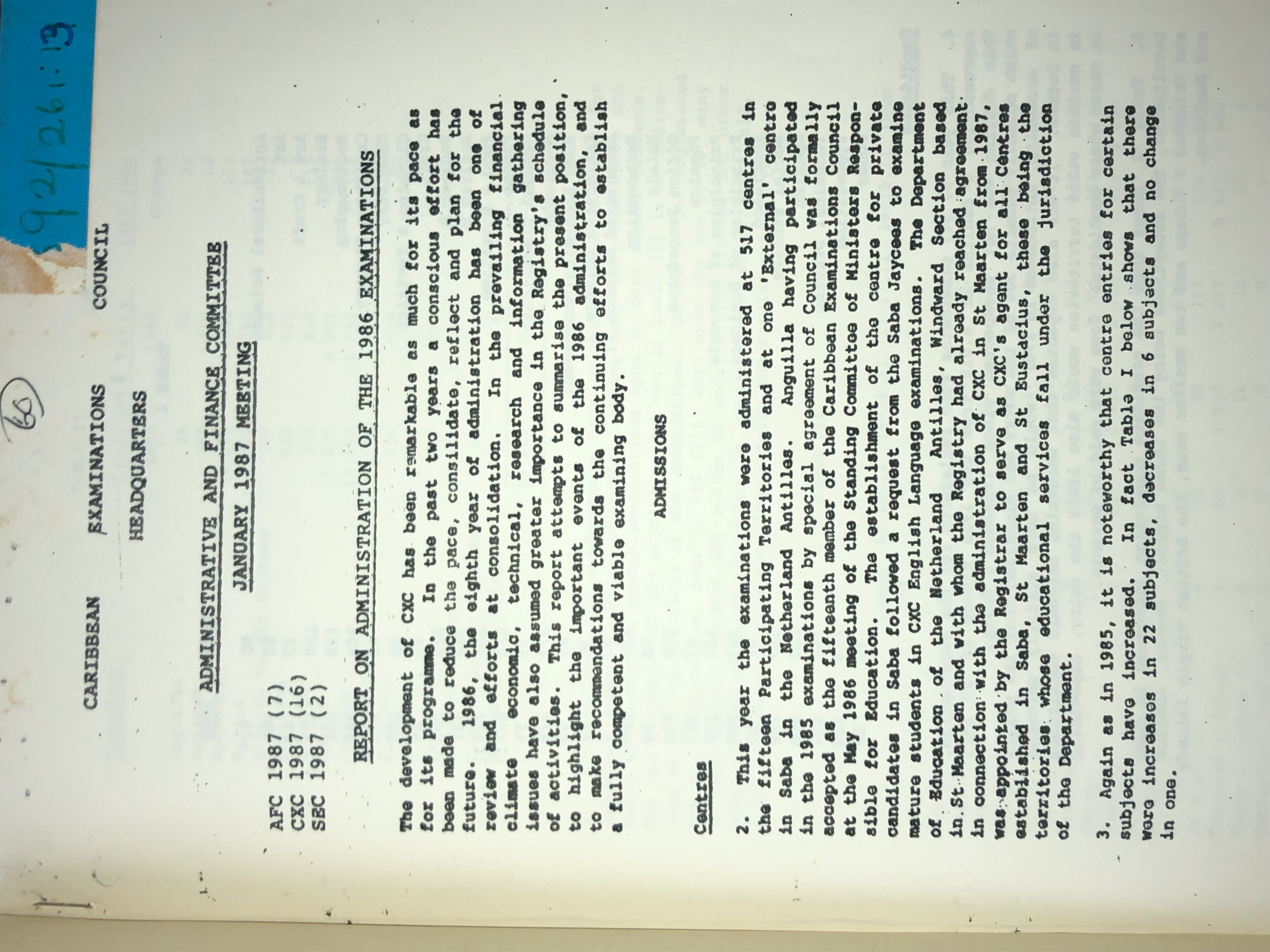 The report of the eighth year of administration of the Caribbean Examination Council (CXC) examinations deals separately with the two sittings of the examination – January and May/June. It covers the following topics in detail: Admissions, Administration, Script Marking, and Finance.