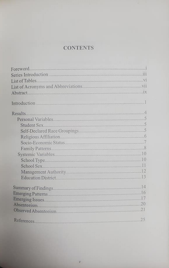 A longitudinal study was designed to trace student survival to the end of the first cycle (third year) of secondary school through a randomly selected representative sample. The sample comprised 2, 125 students and 64 classroom groups—10 percent of the students of one year entry. Data gathering by questionnaire, interviews, and small-scale observation was done during the last five weeks of each school year. Results revealed that dropouts was greatest at the end of Year 2 (2.8 percent) and, in that year, was highest among students starting school with Common Entrance (CEE) marks, students from low income homes, males, students of remote schools, students in Muslim Board managed schools and students of African descent, and was related to situations where problems were more personal. Dropout in Year 3 was highest among girls, students who considered themselves White, and related to situations where the problem was within the school environment. Dropout of boys from boys’ schools, children of mixed descent, and children from father-only and grandparent or guardian-headed household continued unabated throughout all three years.