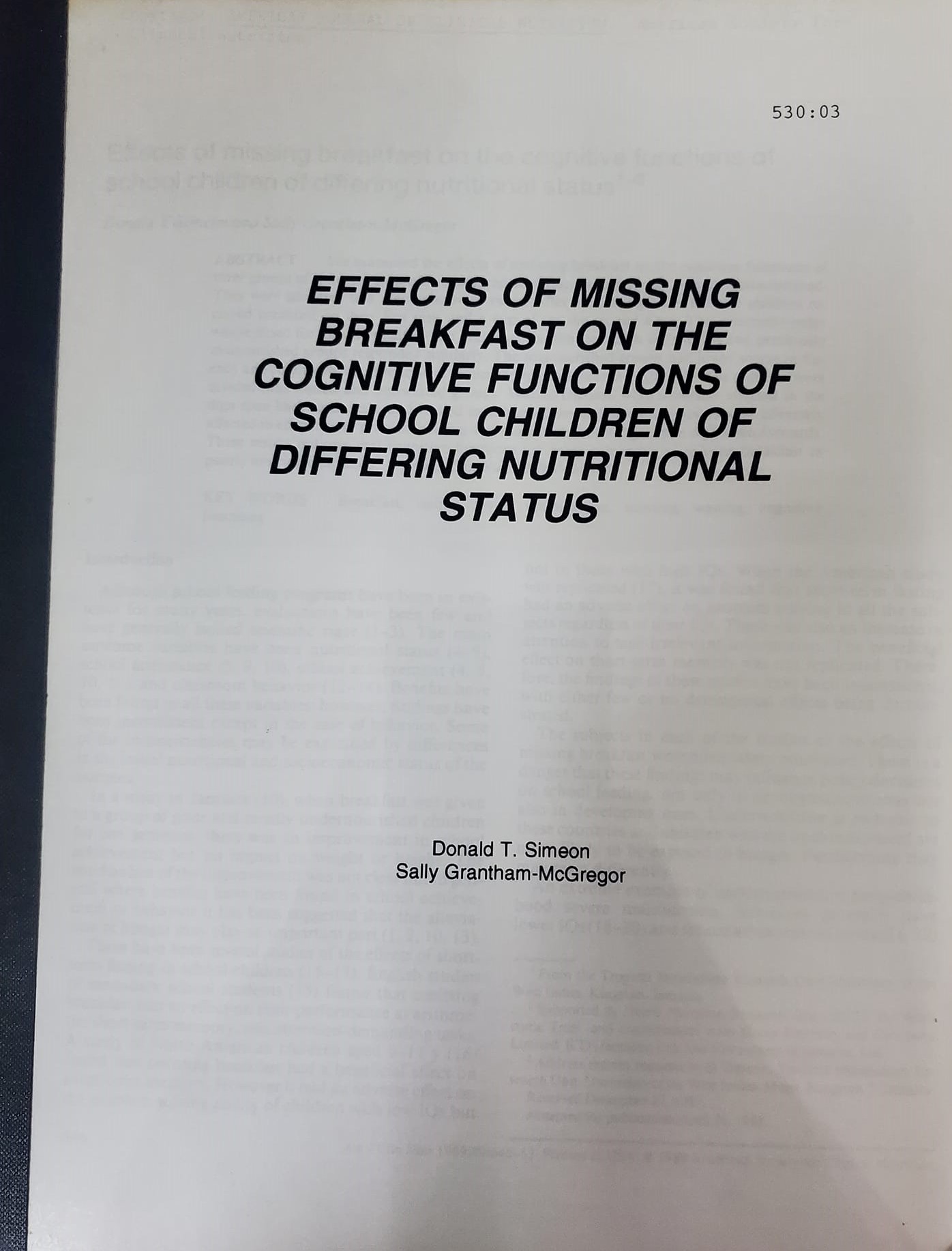 The effects of omission of breakfast were examined in three groups of poor children aged 9- and 10-years-old—stunted (n=30), non-stunted controls (n=30), and previously severely malnourished (n=30). They were admitted to a metabolic ward on two occasions, one week apart. After an overnight fast, half the children received breakfast on their first visit and a cup of tea the second time. The treatment order was reversed the second time. The breakfast (590 Cals) comprised items from the Jamaican school-feeding programme. When breakfast was omitted, the stunted and previously severely malnourished groups responded similarly and differently from the control group. Both malnourished groups had lower scores in the fluency and visual short-term memory (coding) tests. In contrast, when fasted, the controls performed better in arithmetic and in problem-solving efficiency. The sample was then divided into wasted and non-wasted sets. When they missed breakfast, the wasted children were adversely affected in their performance of the digit span backwards test, a measure of auditory short-term memory with an immediate processing element. In addition, the wasted members of the malnourished groups were adversely affected in the efficiency of problem solving. The wasted controls also had lower scores in the digit span forward test (auditory short-term memory) when breakfast was omitted. All the findings remained when the children’s usual caloric intake for breakfast and their IQ’s were statistically controlled.