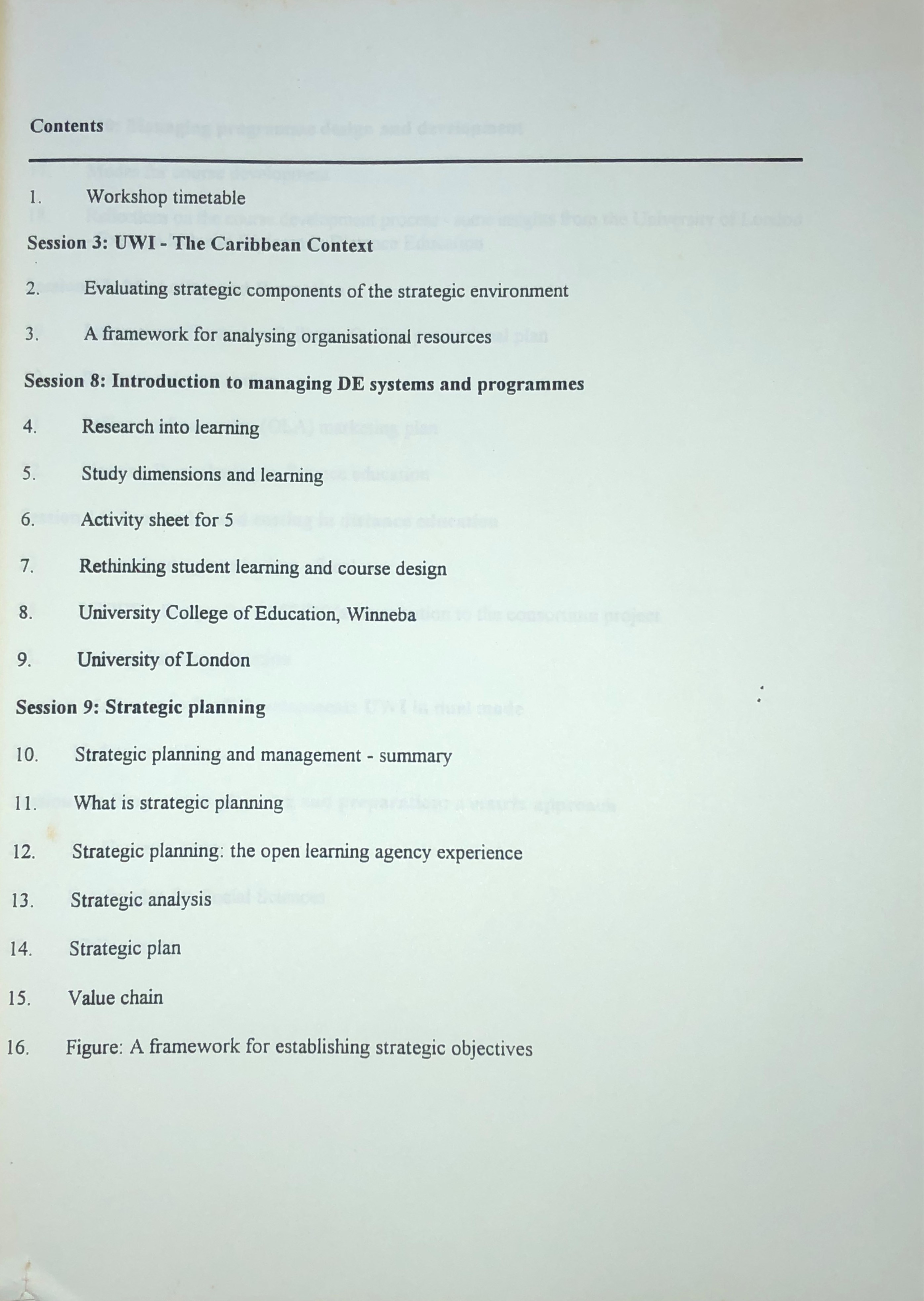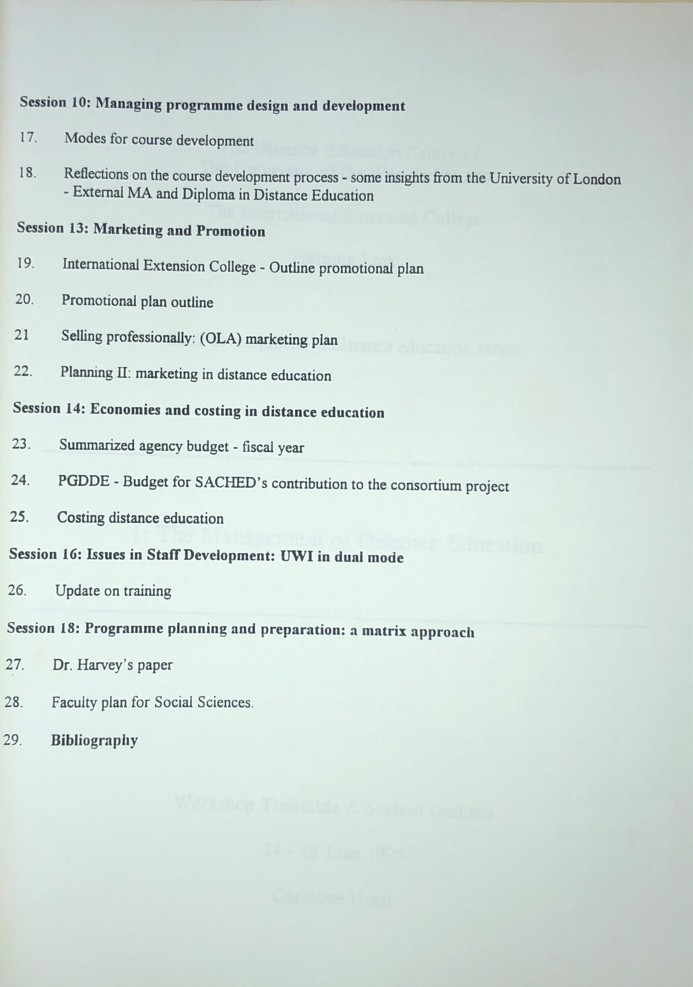| dc.description.abstract | This workshop item forms the first of a series of three presented jointly by the University of the West Indies and the International Extension College. The intention is to introduce staff working at the UWI to some of the issues, consideration and implications of establishing and maintaining distance education programmes in a regional university. The programmes is designed to support the university plan to extend educational opportunities and provisions through the development and introduction of dual mode programmes. | en_US |