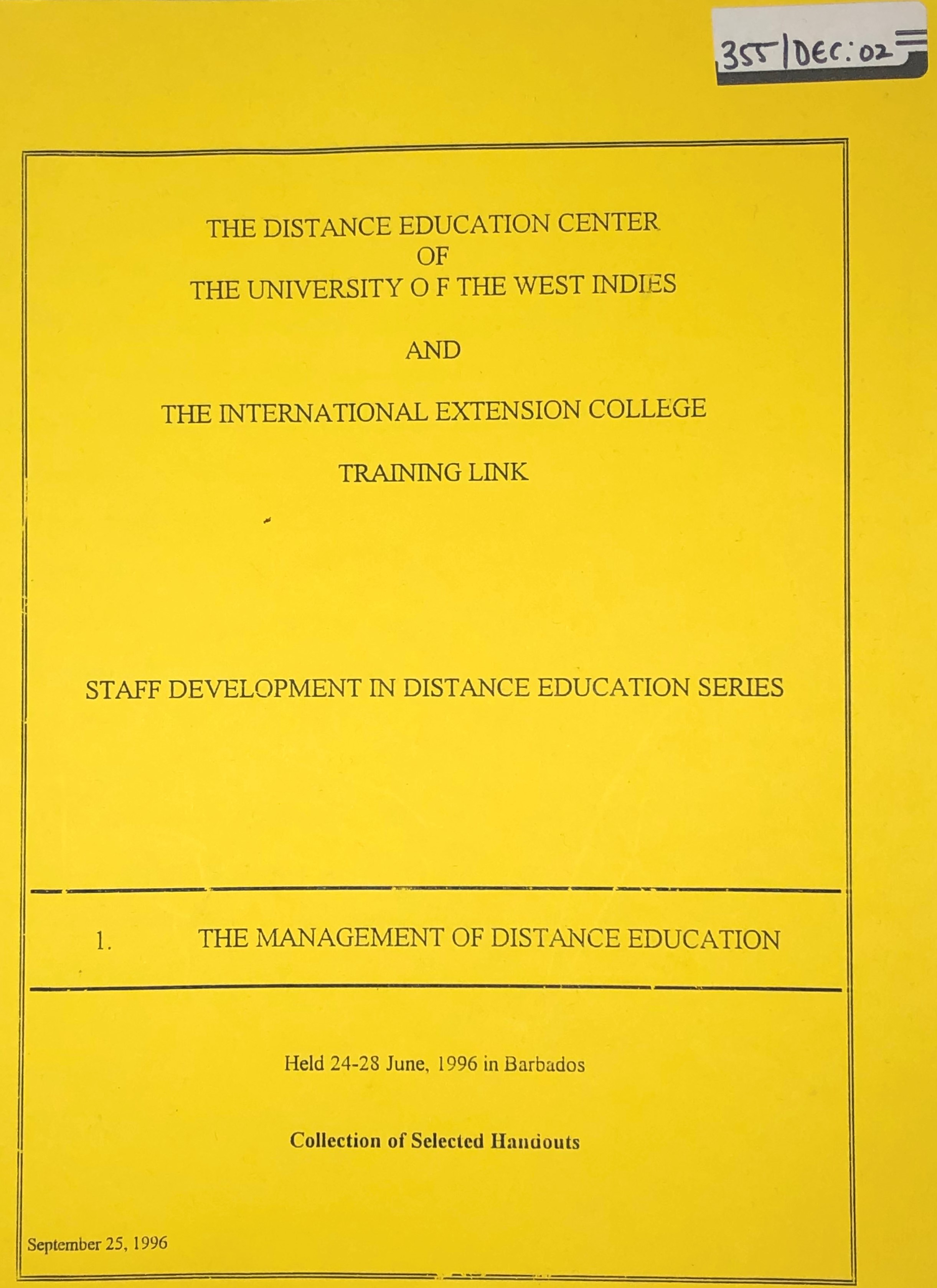 The Management of Distance Education: Held 24-28 June, 1996 Barbados: Collection of Selected Handouts
