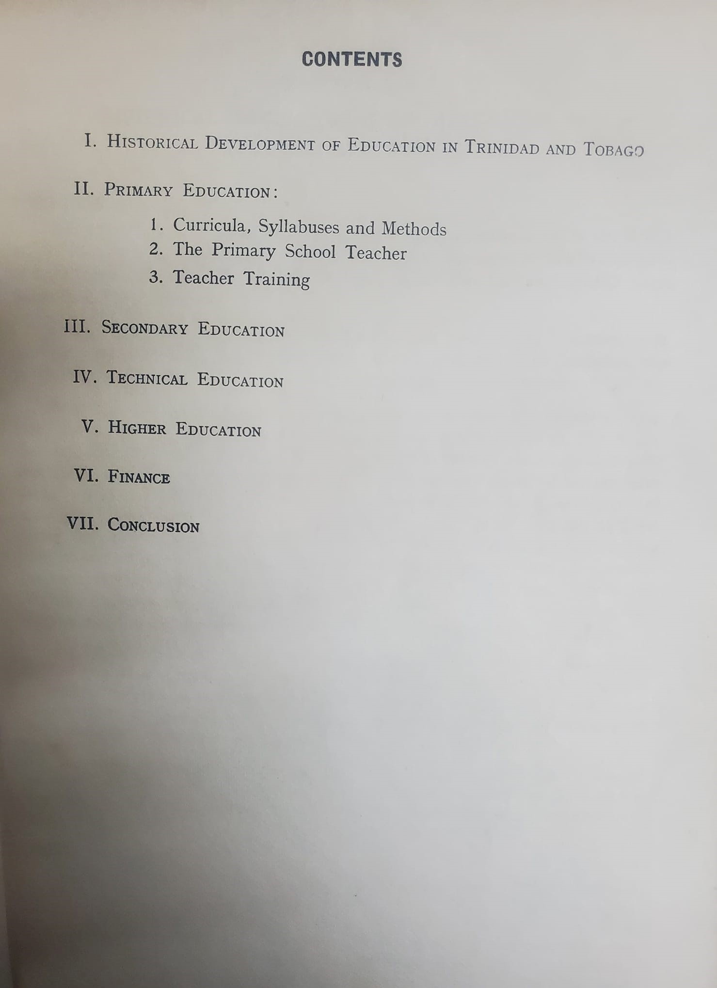 This publication covers the development of primary education, secondary education, technical education, and higher education in Trinidad and Tobago during the periods 1800-1850, 1851-1900, 1901-1925, 1925-1950, and 1951-1962.