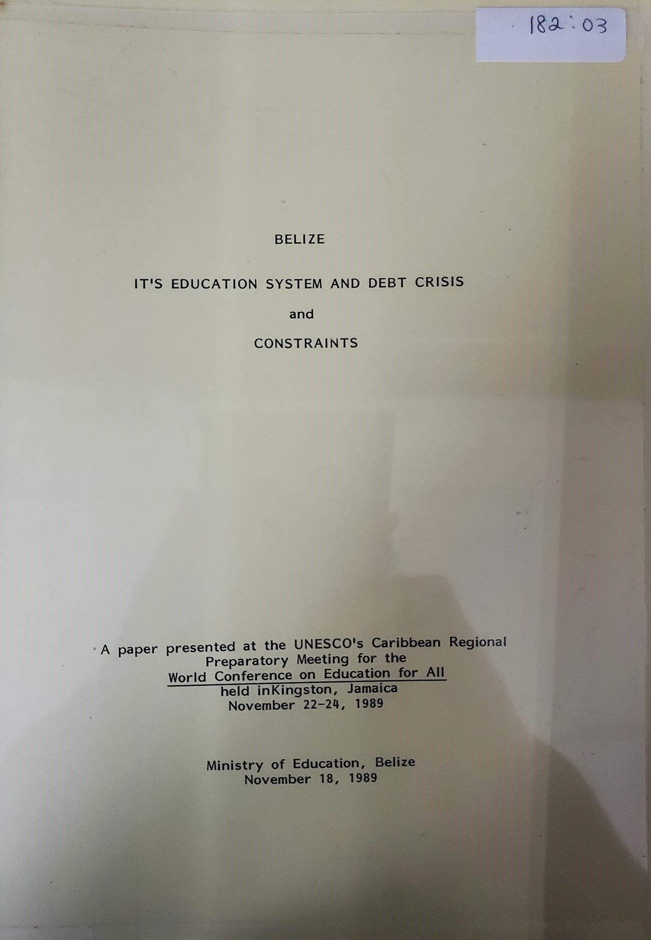 This paper was prepared in response to a request for a presentation on “The debt crisis and its impact on Belizean education.” However, it was determined that Belize was not experiencing a debt crisis, so the paper provides: (a) information on socio-economic conditions in Belize; (b) a description of the organization, management, and functioning of education; (c) a comment of debt servicing and its implications for education; and (d) a brief discussion of four major constraints of educational development: education planning, teacher quality, textbooks, and school buildings and maintenance.