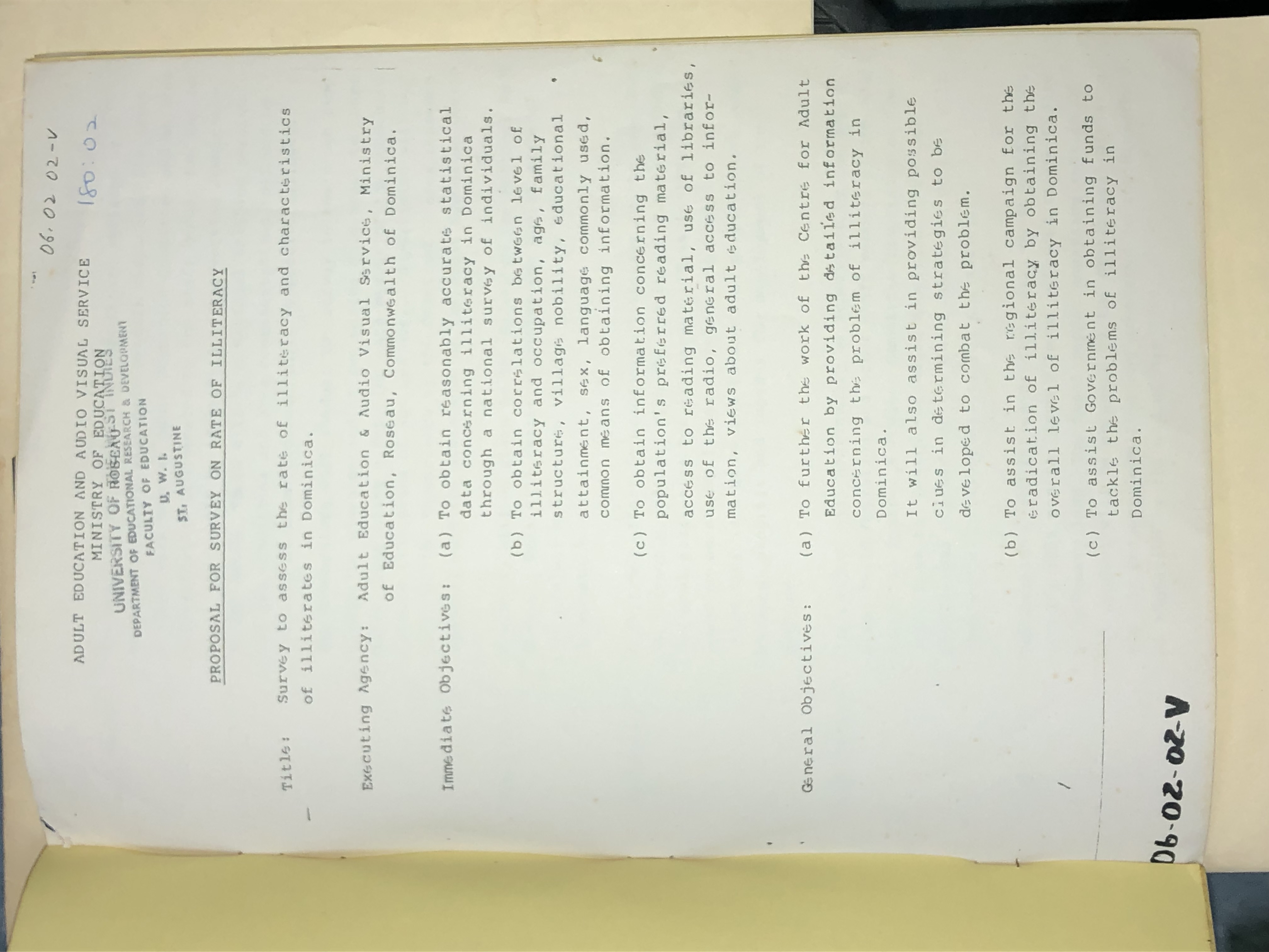 This item is a proposal for a survey to access the rate of illiteracy and characteristics of illiterates in Dominica.