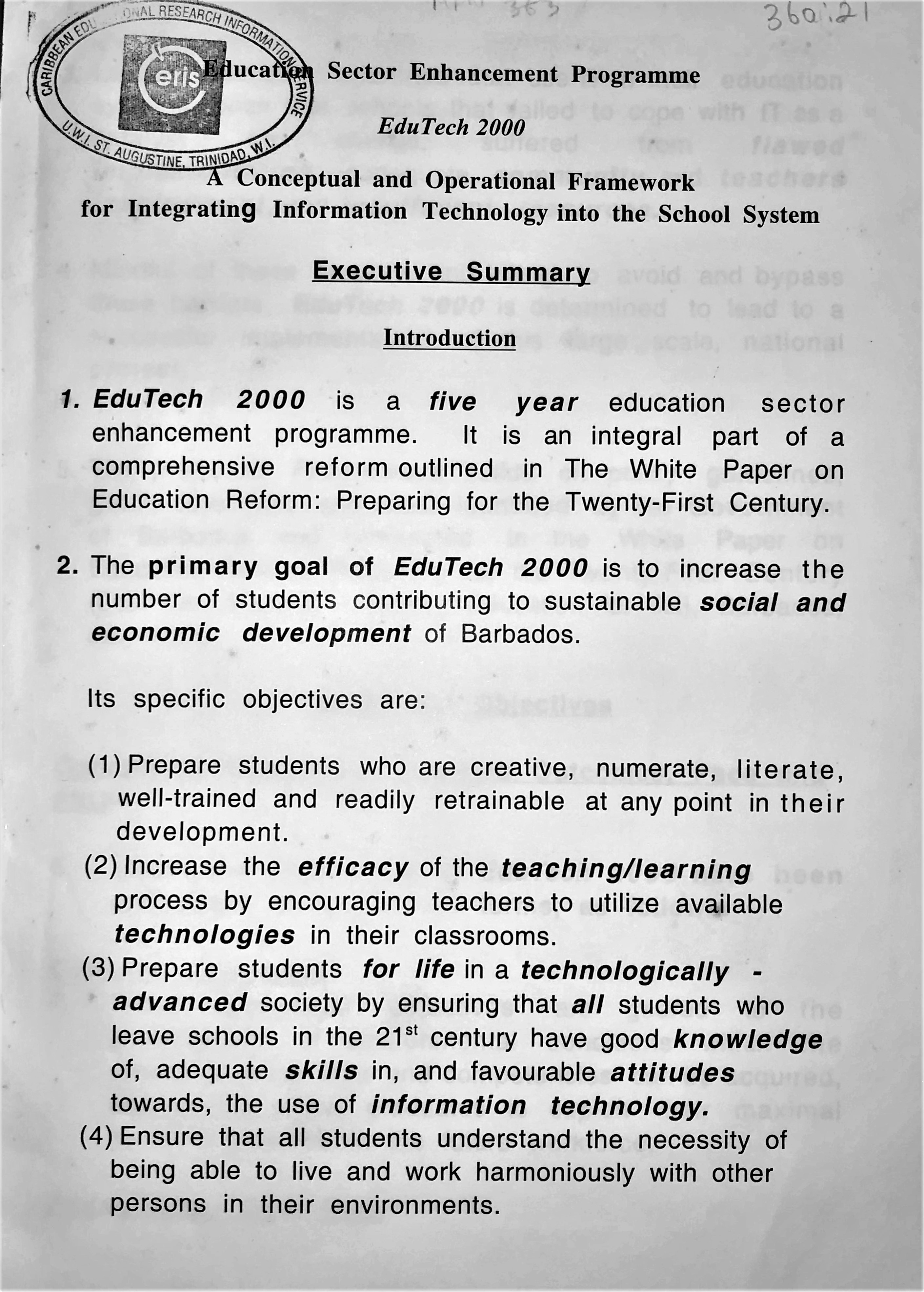This document summarizes the following: 1) the goals and objectives of EduTech 2000, 2) the rationale for the programme, 3) the theories and concepts underlying the programme, 4) the content and curriculum, and 5) the organizational framework for the operationalization of the programme.