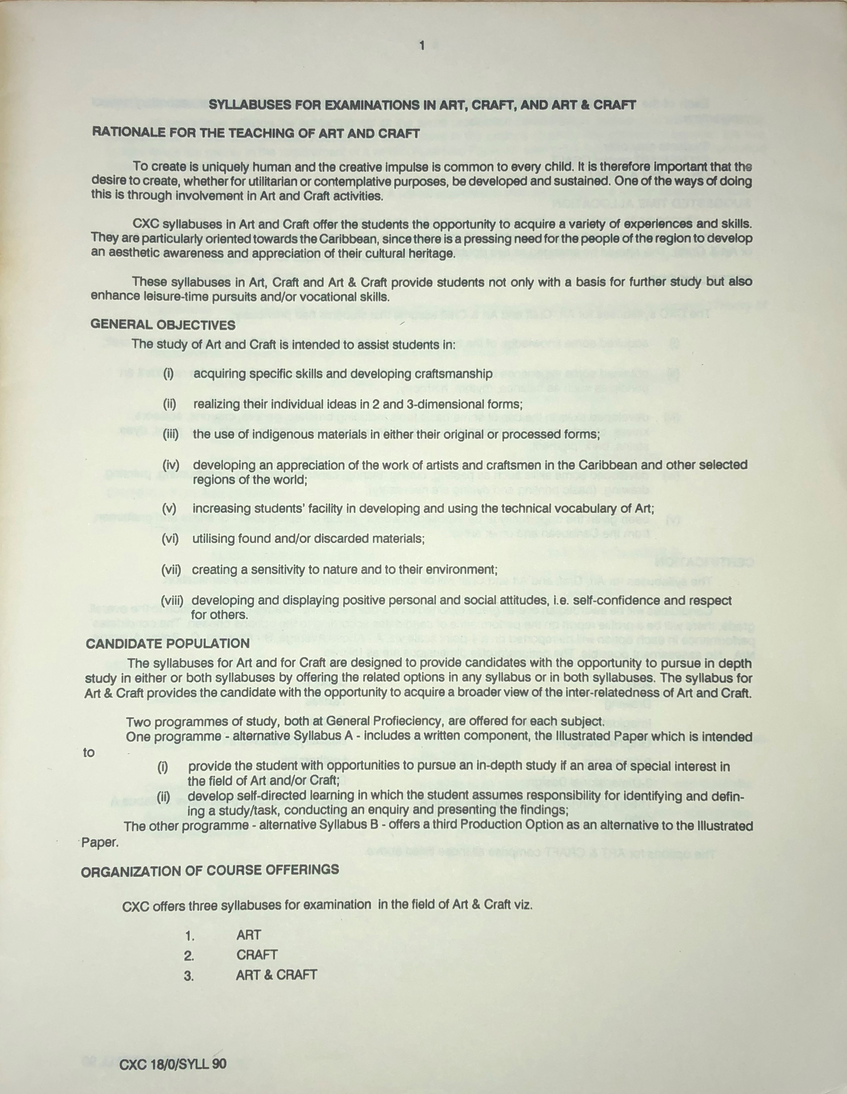 | dc.description.abstract | These syllabuses in Art, Craft, Art and Craft provide students not only with a basis for further study but also enhance leisure-time pursuits and/or vocational skills. The major revisions to this syllabus for 1992 are: (i) the discontinuation of the subject offerings at Basic Proficiency; (ii) the introduction of an alternative scheme of certification at General Proficiency; (iii) the introduction of a fifth option – Decorative Craft – to the Craft syllabus. | en_US |