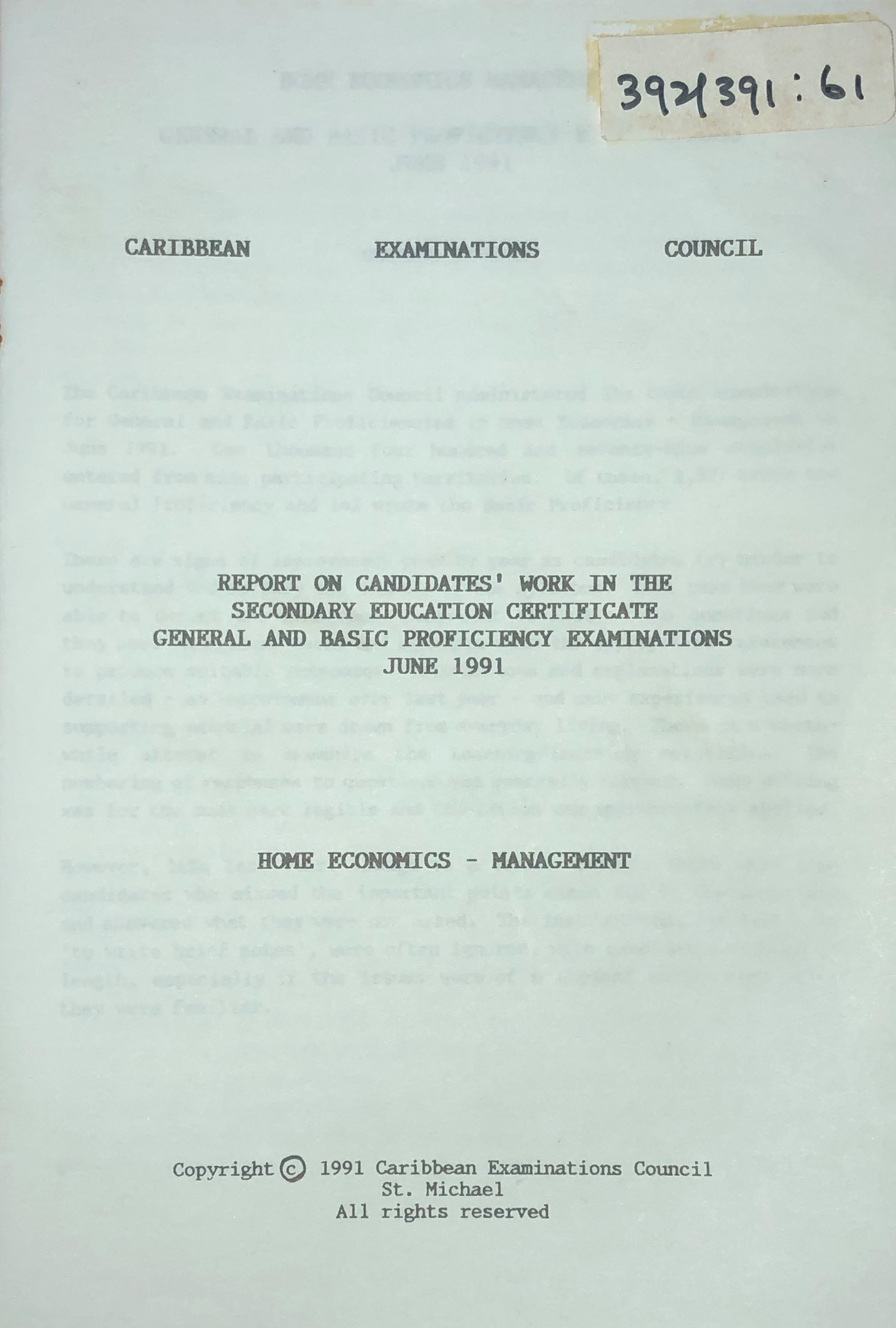 Report on Candidates' Work in the Secondary Education Certificate General and Basic Examinations June 1991: Home Economics-Management