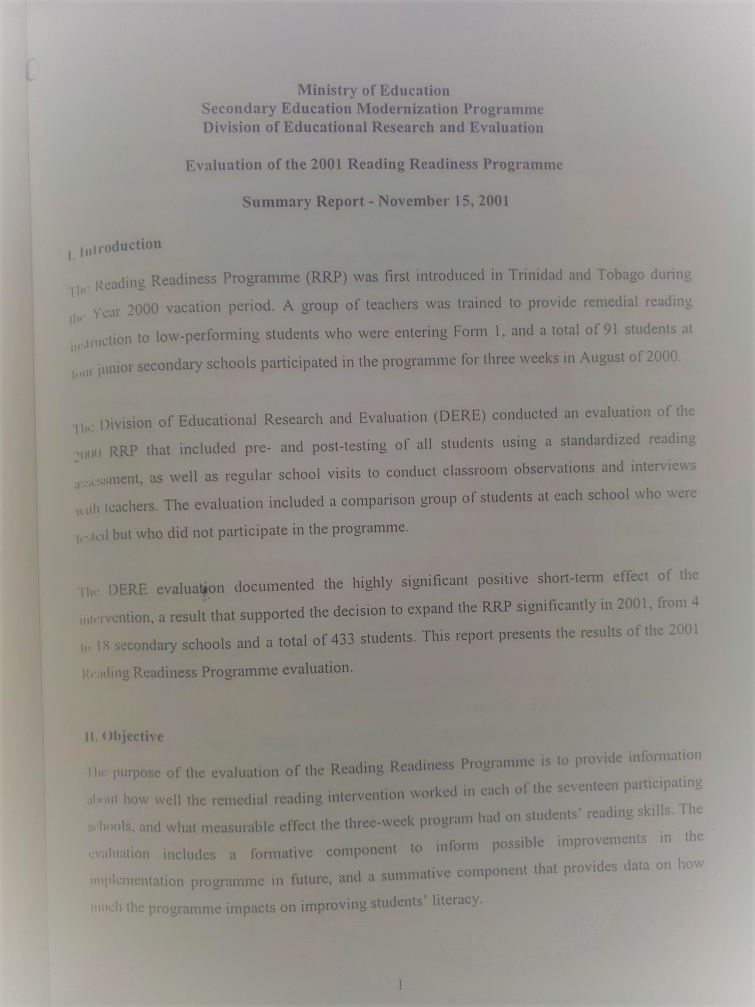 This 2001 evaluation of the Reading Readiness Programme in Trinidad and Tobago was intended to provide information on the performance of the remedial reading intervention in each of the 17 participating schools, and the measurable effect of the three-week programme on students’ reading skills. It was found that teachers were able to provide individualized instruction and support for students at 18 sites, and that students had responded enthusiastically and many had benefited from the three-week programme.