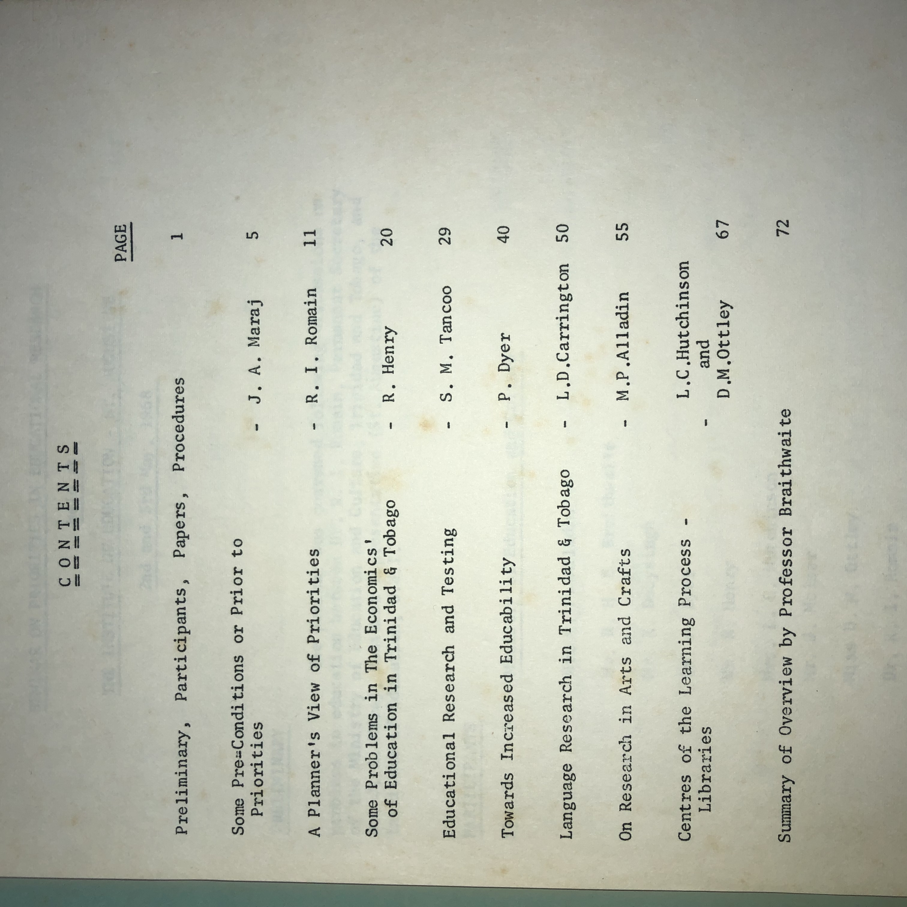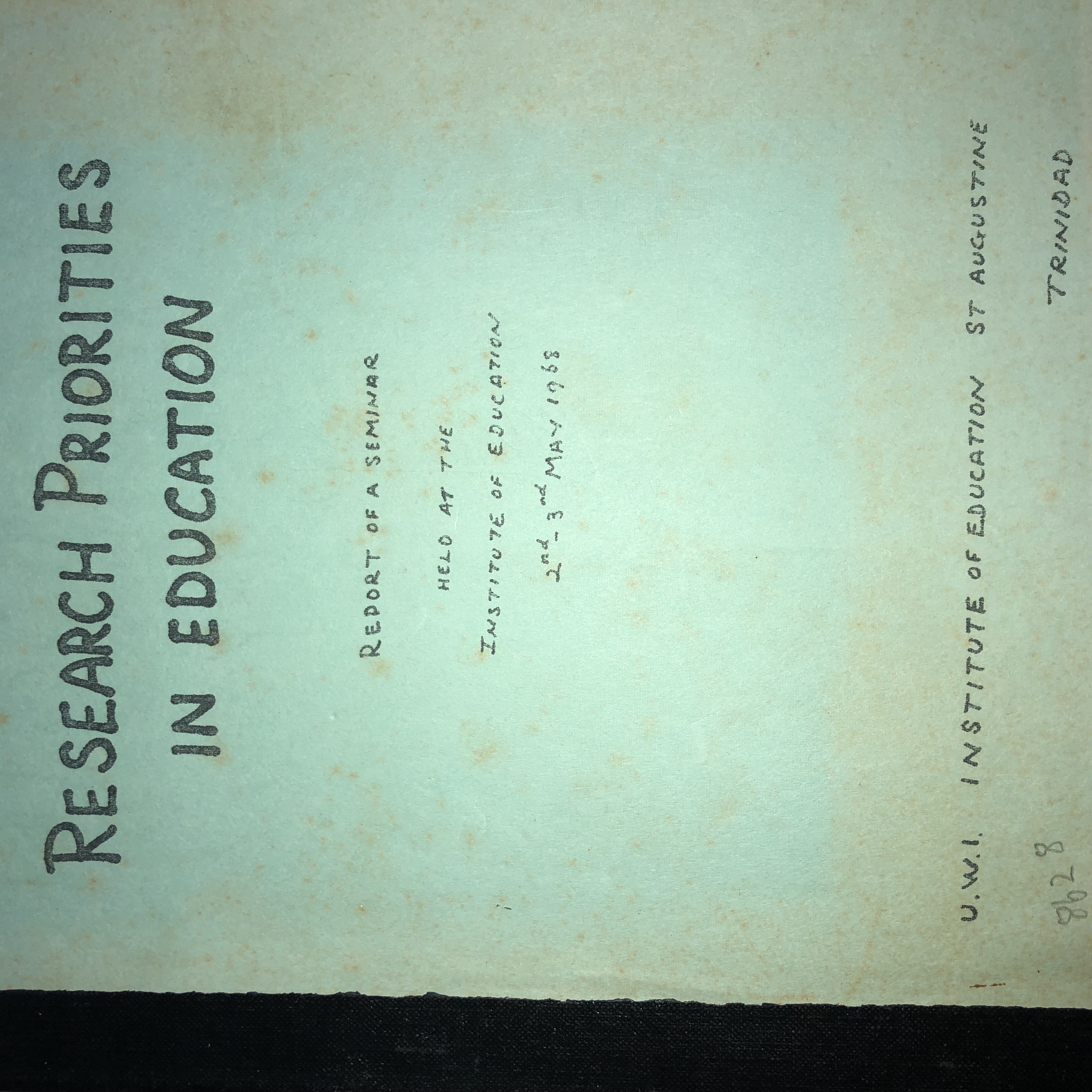 This volume contains the texts of the following papers that were presented at the seminar: 1) Some pre-conditions or prior to priorities by J. A. Maraj; 2) A planner’s review of priorities, by R. I. Romain; 3) Some problems in the economics of education in Trinidad and Tobago, by R. Henry; 4) Educational research and testing, by S. M. Vancoo; 5) Toward increased educability, by P. Dyer; 6) Language research in Trinidad and Tobago, by L. D. Carrington; 7) On research in arts and crafts, by M. P. Alladin; and 8) Centres of the learning process – Libraries, by L. C. Hutchinson and D. M. Ottley.