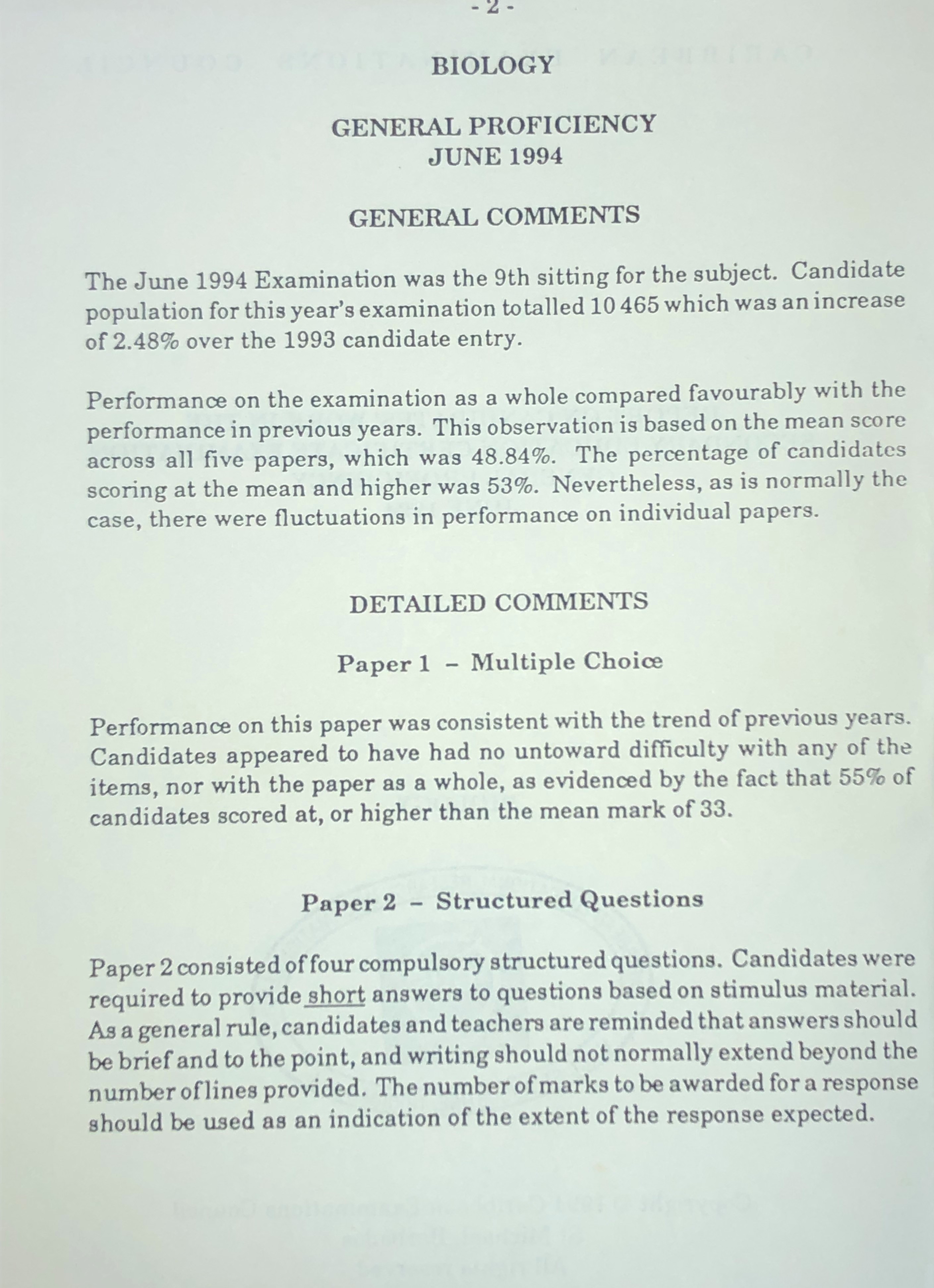 This report provides general and detailed comments on the performance of candidates in the June 1994 Caribbean Secondary Education Certificate (CSEC) general proficiency examinations in Biology.
