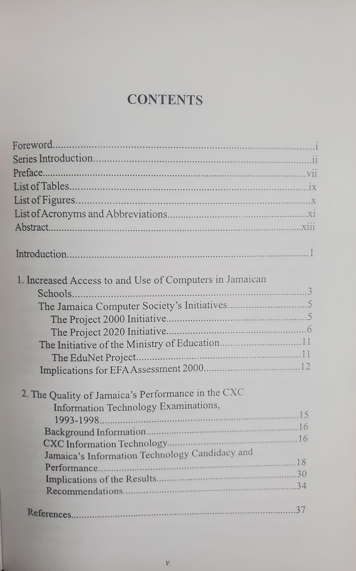 This monograph describes the initiatives that enabled the introduction of computers to Jamaican primary and secondary schools. It also describes student performance on the Caribbean Examinations Council (CXC) Information Technology (IT) examination over a period of six years. The results show that each year more candidates were entered for the Technical Proficiency level than the General Proficiency level of the examination. The monograph further shows that student performance at the General Proficiency level steadily improved over the six years, while it fluctuated at the Technical Proficiency level. It highlights the fact that the performance of Jamaican candidates improved significantly in the year CXC instituted the six-point grading system. However, most of the passes were below the Grade 1 level. The data suggests that there may be deficiencies in the education system that caused IT teachers to show a preference for teaching the Technical Proficiency syllabus. The implications of this occurrence as it relates to tertiary level training in computer science are discussed.