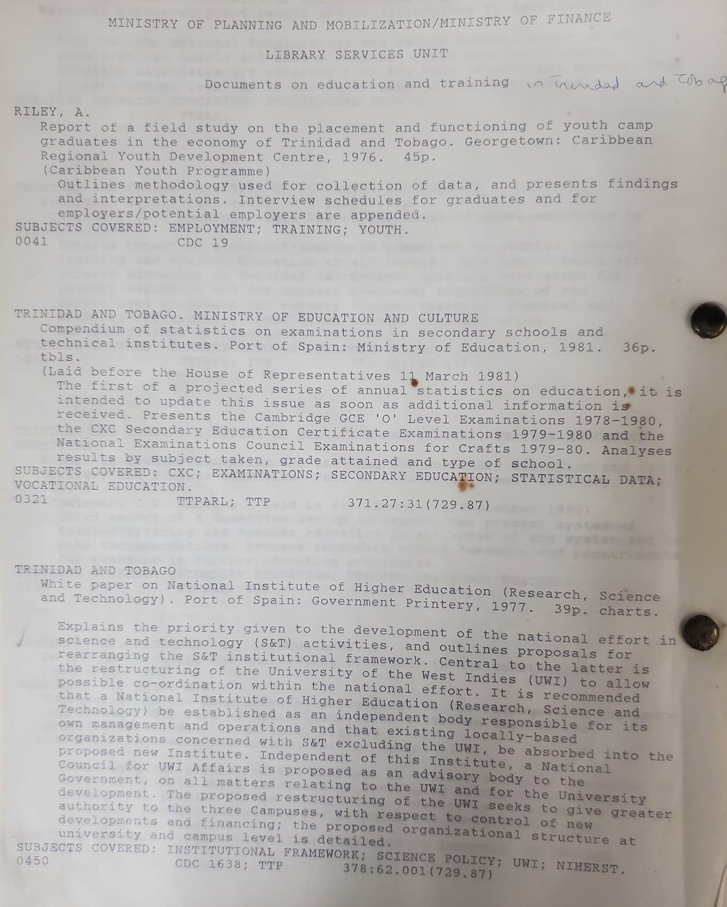 This document contains a bibliography on education and training in Trinidad and Tobago.