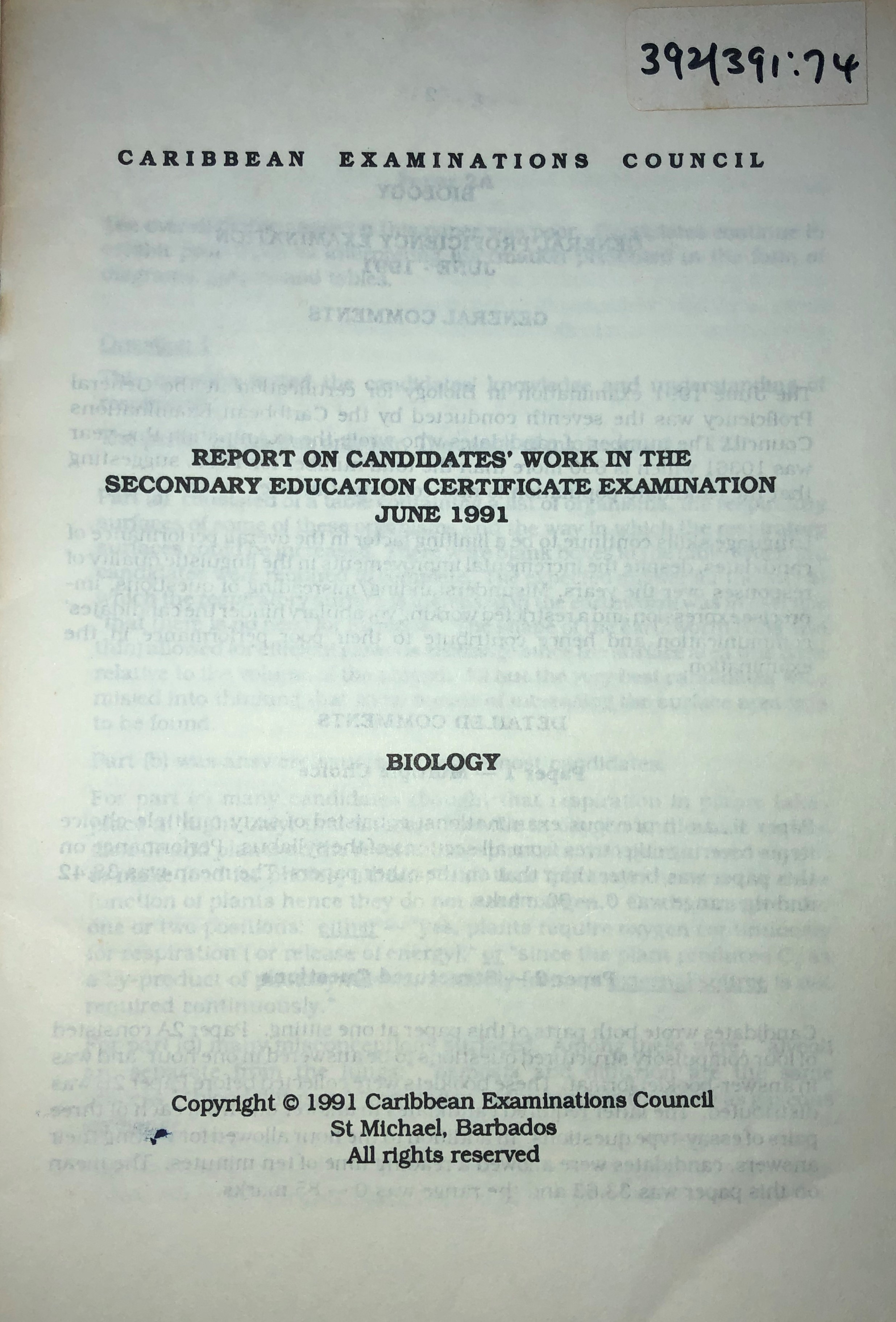 Report on Candidates' Work in the Secondary Education Certificate Examination June 1991: Biology