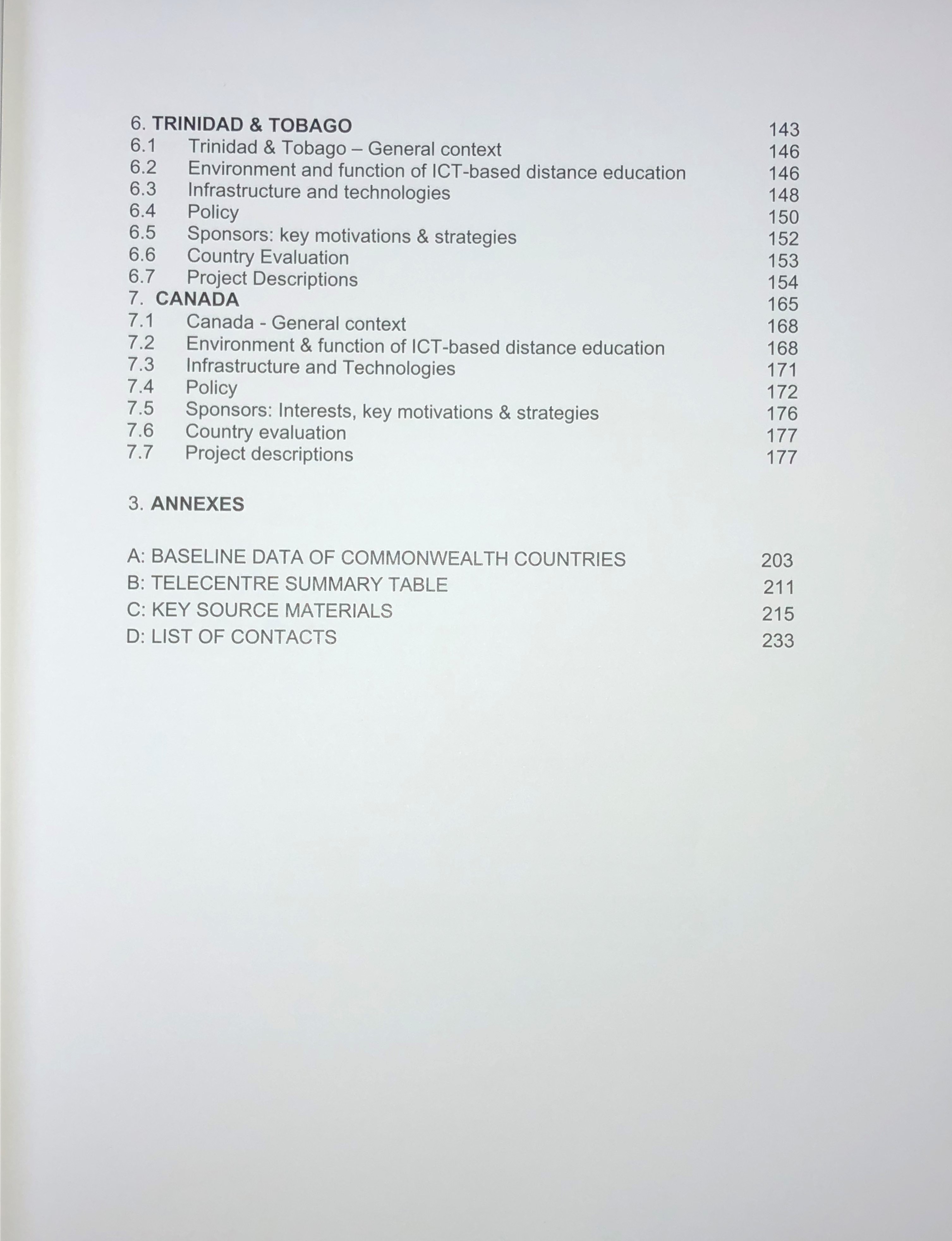 This report sought to: 1) provide an appreciation of affairs regarding the level, range and diversity of information and communications technology (ICT) in use for learning and distance education in Commonwealth countries; 2) highlight key policy and regulatory issues relating to telecommunications and media impacting the use of ICT for education and learning, the financing and operation of infrastructure services, and the self-sustenance of projects; 3) examine the impact of technological trends on future use of ICT for learning and distance education; 4) review of the experience of multi-purpose tele-centres in selected Commonwealth countries and provide basic guidelines for successful models. Six country case studies were undertaken to examine ICT-based learning and distance education across the Commonwealth: Canada, Trinidad and Tobago, Fiji, South Africa, Mozambique, and Ghana. Each country is presented in a standard format providing full socio-economic, policy, and technological context: 1) Baseline data on the country, economy, education, and IT and telecommunications; 2) General country context; 3) Environment and function of ICT-based distance education; 4) Infrastructure and technology 5) Overview of the policy environment in the relevant sectors; 6) Sponsors: Interests, key motivations and strategies; 7) Country evaluation; and 8) Descriptions of ICT projects.