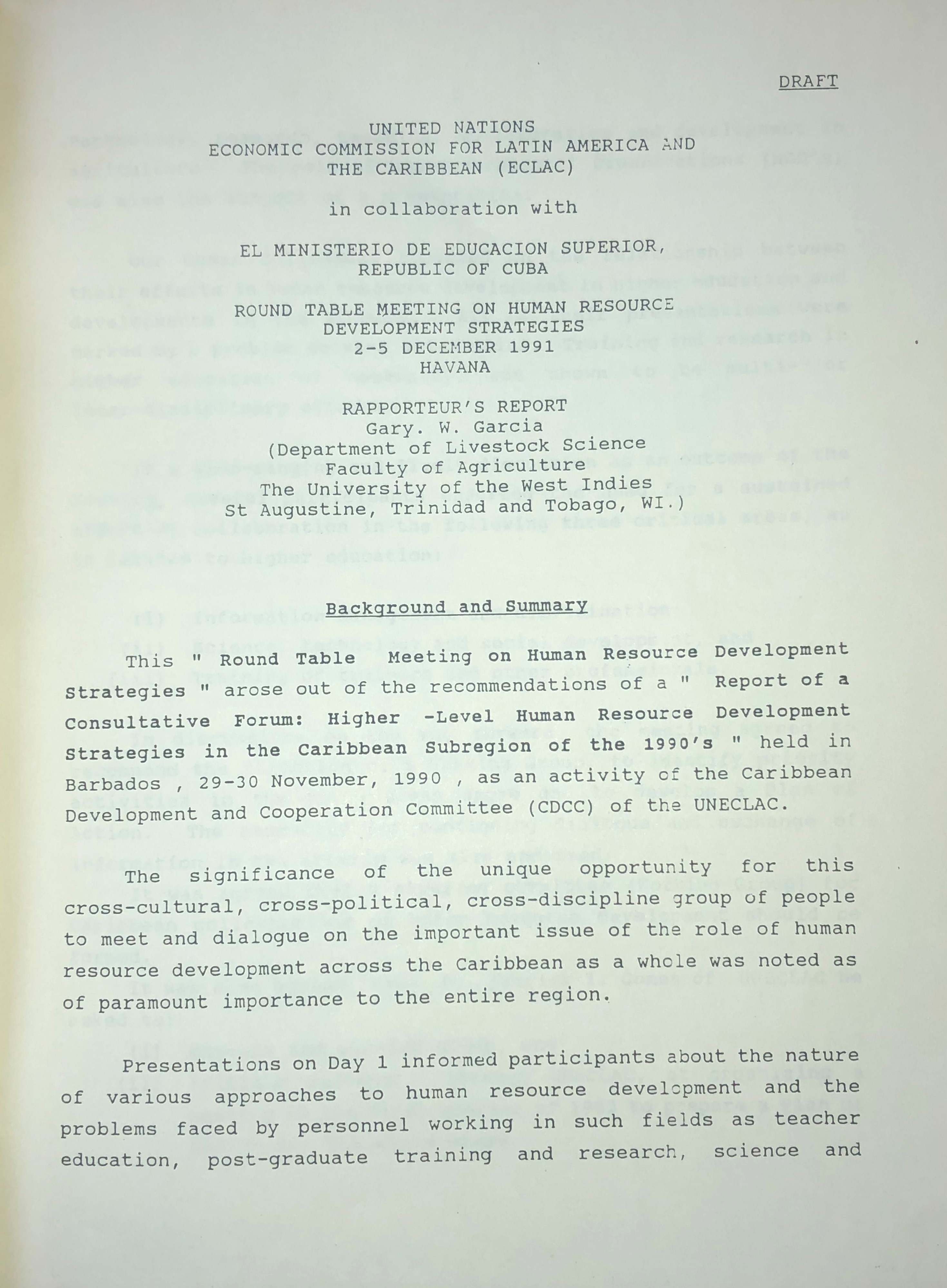 United Nations Economic Commission for Latin America and the Caribbean (ECLAC) in collaboration with El Ministerio de Educacion Superior, Republic of Cuba. Round table meeting on Human resource Development strategies 2-5 December 1991, Havana