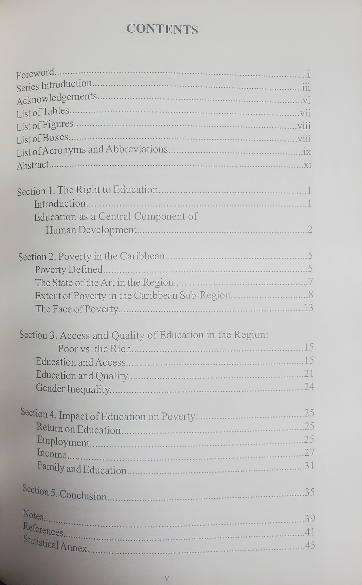 This monograph examines the poor and their relationship with the education system in the Caribbean through an analysis of data from poverty assessments in selected Caribbean countries. It posits that education is one of the single most vital elements in combating poverty and that it is a right. The monograph suggests that there is genuine belief in schooling and that it will lead to better opportunities and an improved standard of living. Parents, rich or poor, expect that the education system will provide their children with the basic skills to either continue with their education or pursue a livelihood that will enable them to enjoy a descent standard of living. It reports that some 38 percent of the population in the Caribbean is classified as poor, and that this poverty acts as a constraining factor to access to education and the quality of the education that is received. The generally low performance level of the education system exacerbates the state of poverty. It is concluded, therefore that the education system is failing one group of children more than others—those that are poor—and thus denying them the opportunity to become contributing members of the society, and to achieve the goal of sustainable human development. It is suggested that what is needed is a rescue plan for the education system, which will transform it into a catalyst for genuine social equity. If not, the existing stratification between rich and poor may reinforce, rather than correct, income inequalities and perpetuate the cycle of poverty.