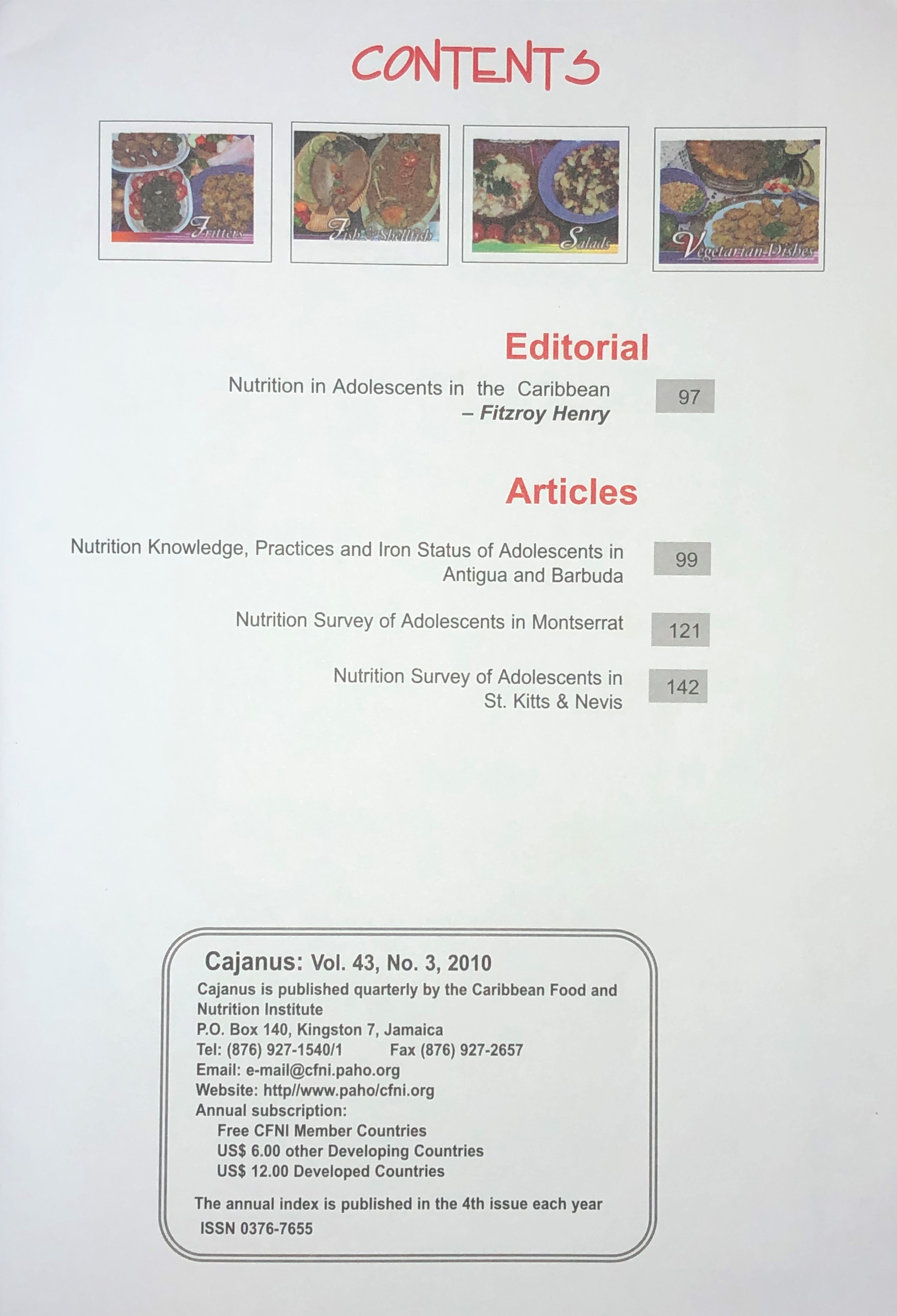 Adolescent nutrition in the Caribbean has two major foci, - body weight and anaemia. Teenagers, both male and female, are quite sensitive about their development and their weight. Many have taken steps to lose or gain weight using various methods. To what extent are their concerns warranted? How many of them use the recommended dietary and physical activity behaviours that may control their weight and improve their health status? This issue of Cajanus explores these questions among others.