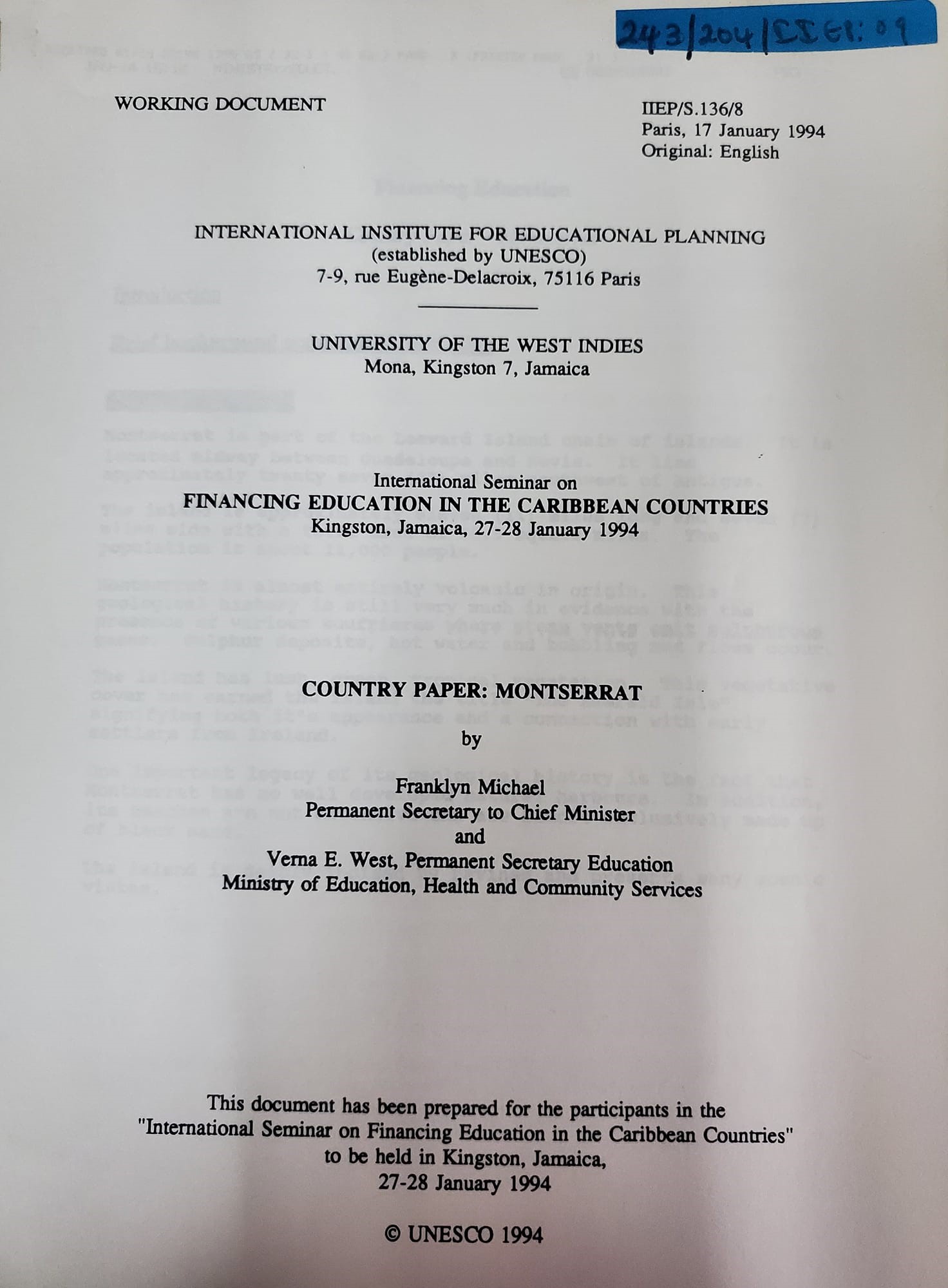 Against the background of economic overview of Montserrat, this paper describes the country’s education system and discusses current patterns of financing education. It identifies some of the problems being experienced and makes some proposals for change.