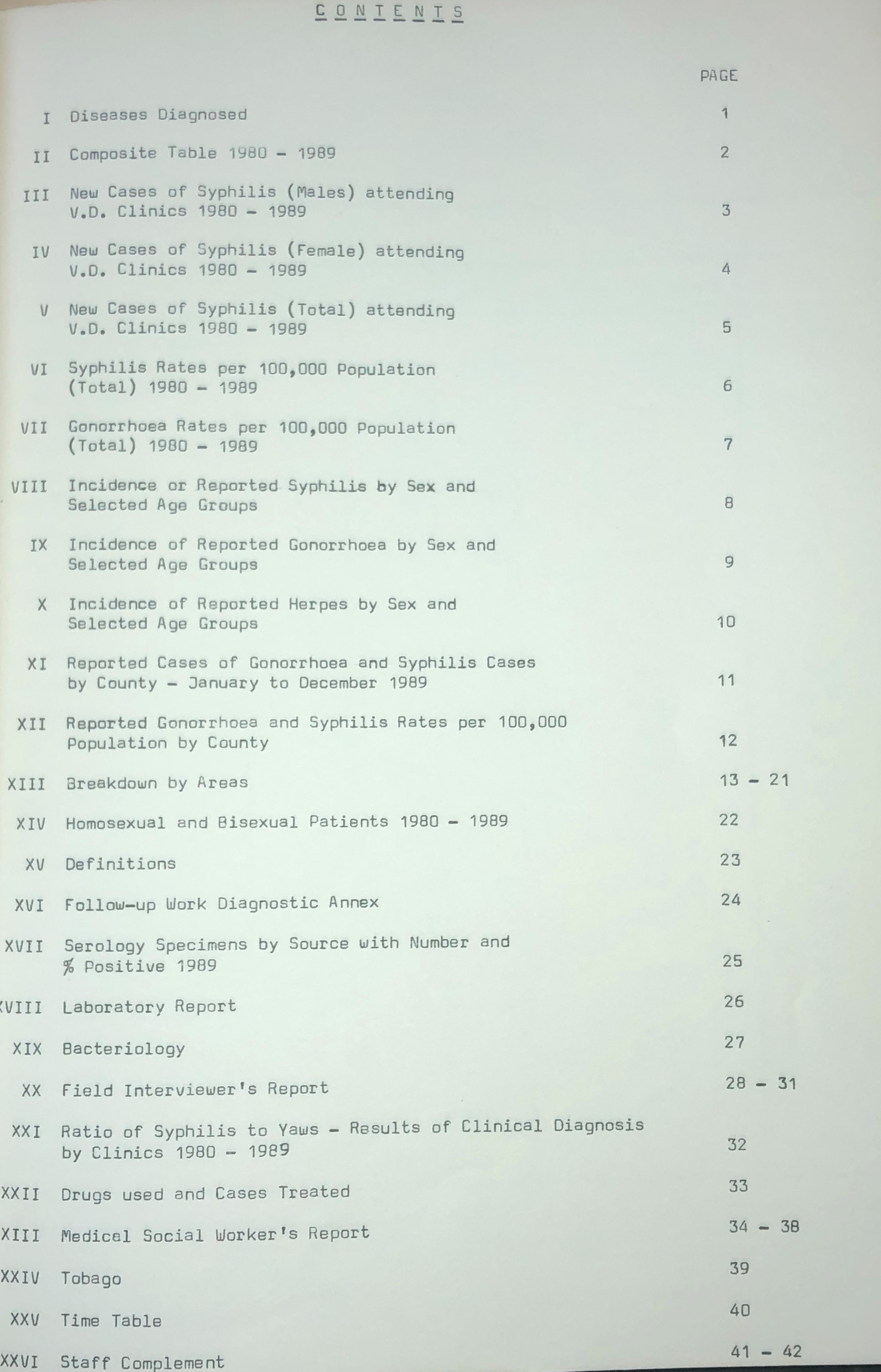 The Venereal Disease and Yaws Division of the Ministry of Health of Trinidad and Tobago continued to take all possible efforts to reduce the high increase of the common Sexually Transmitted Diseases and to keep the others under control during the year 1989. The statistics given in this report relate to work done in the S.T.D. Clinics only. The figures for gonorrhoea showed a decline for the second consecutive year. Three thousand eight hundred and seven (3,807) cases were diagnosed and treated in 1989 as compared to four thousand three hundred and seventeen (4,317) in 1988 a decrease of five hundred and ten (510) cases or 11.8%.