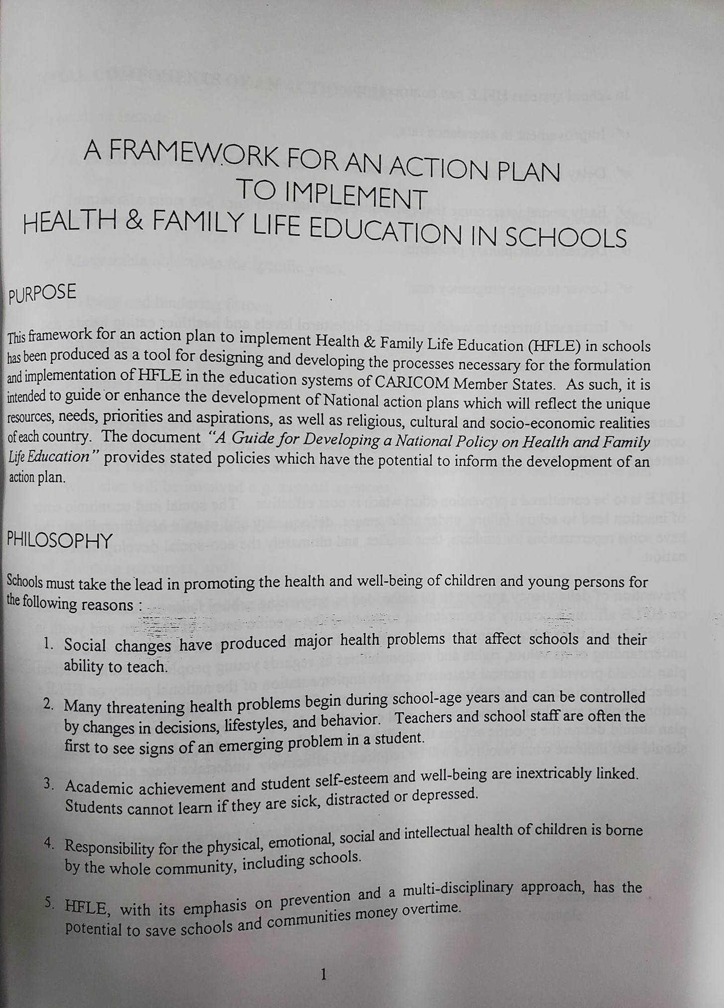 This framework was produced as a tool for designing and developing the processes necessary for the formulation and implementation of health and family life education (HFLE) in the education systems of CARICOM Member States. As such, it is intended to guide or enhance the development of national action plans that reflect the unique resources, needs, priorities, and aspirations, as well as religious, cultural, and socio-economic realities of each country.