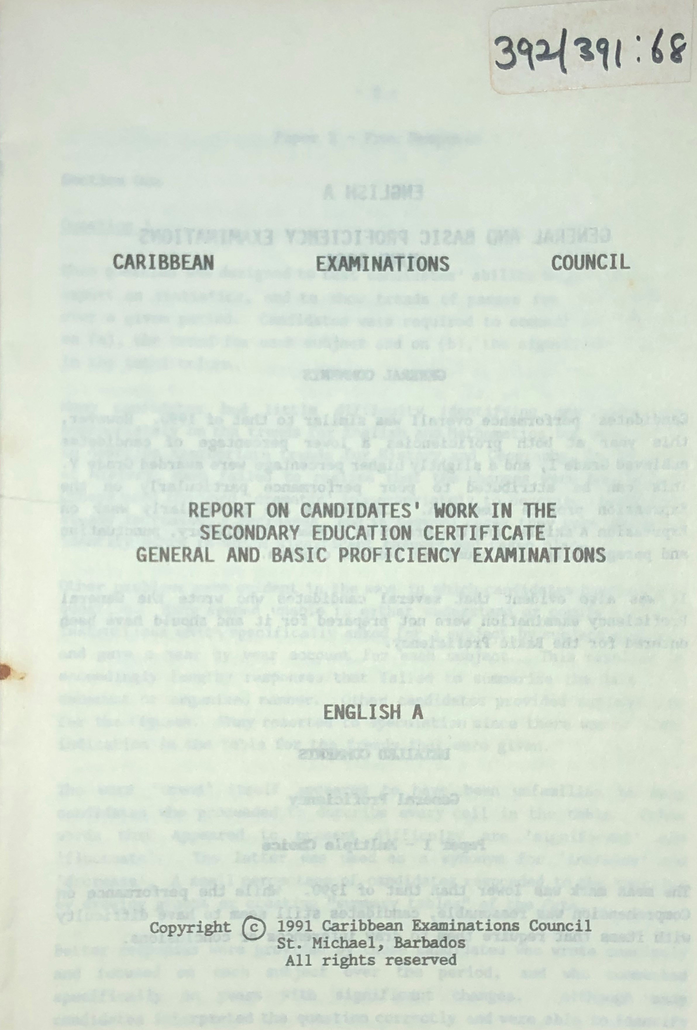 Report on Candidates' Work in the Secondary Education Certificate General and Basic Proficiency Examinations June 1991: English A