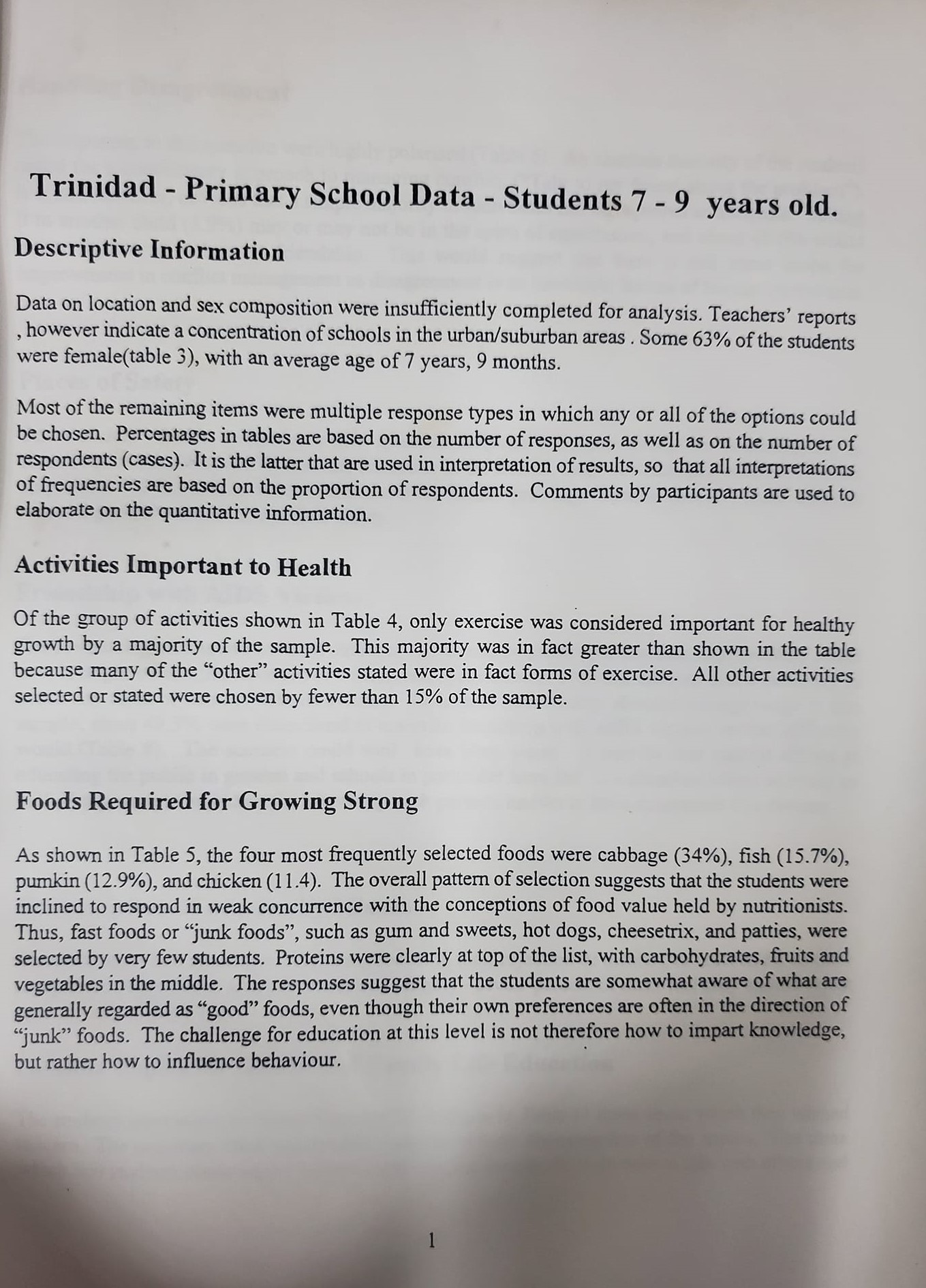 The HFLE Needs Assessment Study was carried out to obtain data on student knowledge and views about health lifestyles, a range of psycho-social issues affecting youth, and some aspects of the modus-operandi of the existing HFLE curriculum. It also sought to explore the problems, concerns, and values of young people; possible goals, outcomes and teaching and assessment methods of HFLE; and factors affecting the teaching of HFLE. The intended respondents were students in primary and secondary schools, and their teachers, principals and parents. This report summarizes and discusses the responses of Trinidadian primary schools students 7-9 years old. These responses suggested that the students were quite aware of what are generally regarded as “good” foods, even though their own preferences were often in the direction of “junk” foods. The order of choice suggested that health-related topics were more popular than those involving interpersonal relationships. The main need was for assistance with homework. Many also required help with talking to parents, suggesting that there is a serious problem with family relationships supportive to education.