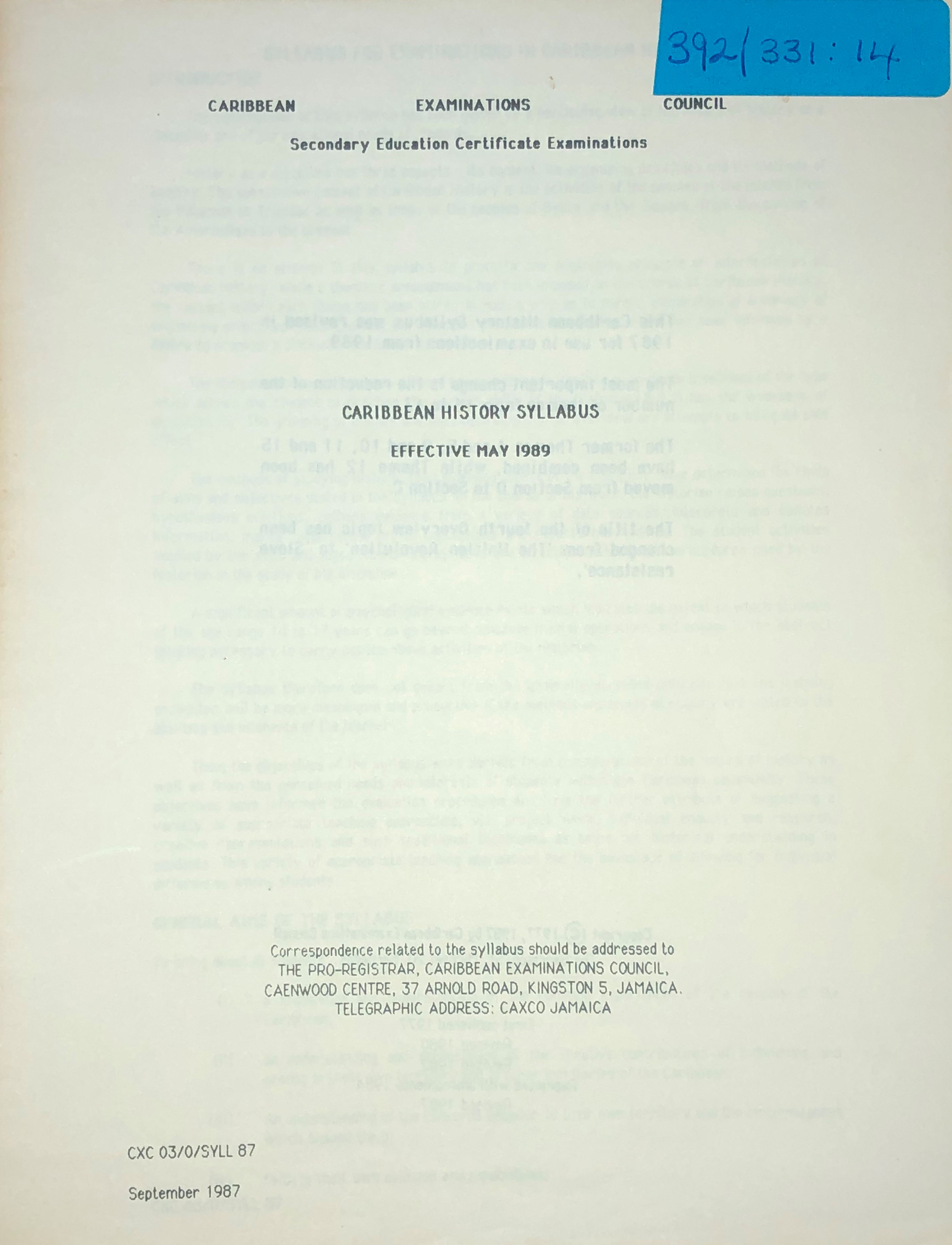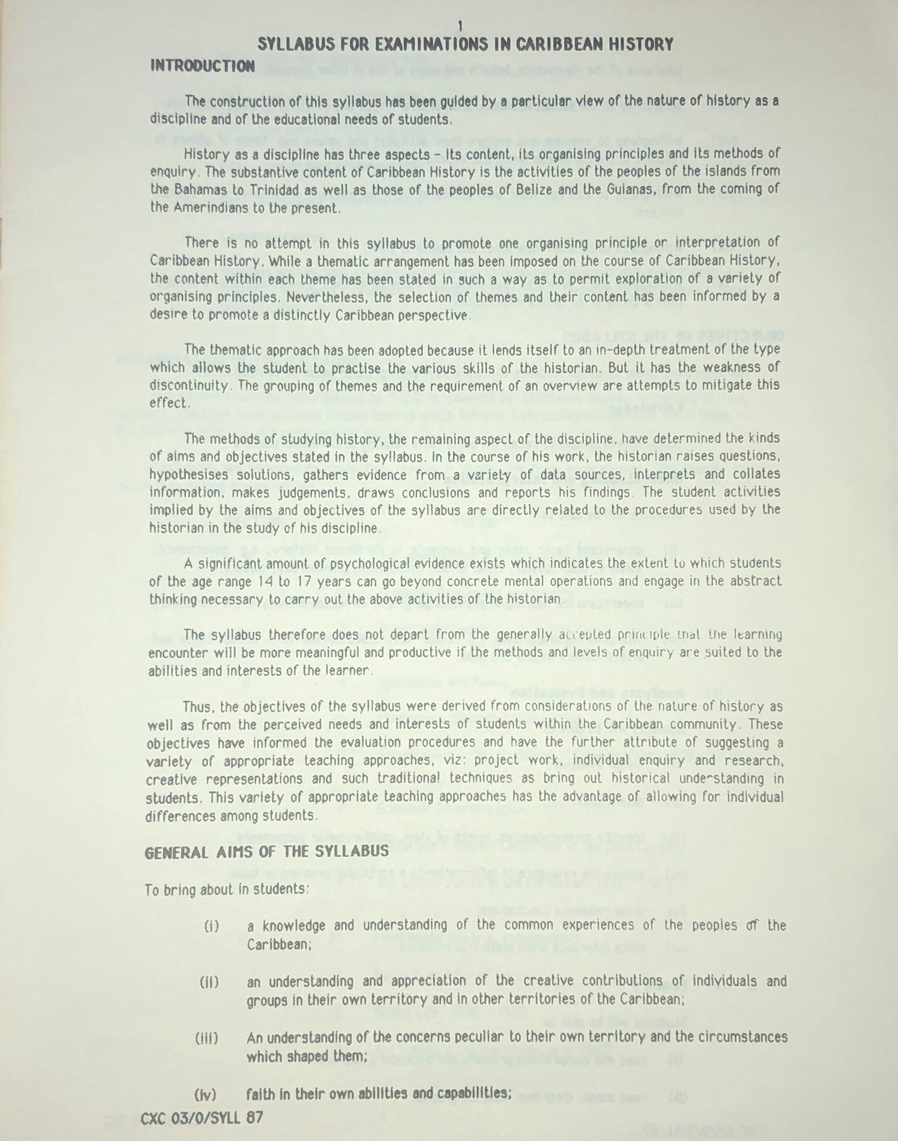 The aim of the syllabus is to bring about in students: 1) a knowledge and understanding of the common experiences of the peoples of the Caribbean; 2) an understanding and appreciation of the creative contributions of individuals and groups in their own territory and in other territories of the Caribbean; 3) an understanding of the concerns peculiar to their own territory and the circumstances which shaped them; 4) faith in their own abilities and capabilities; 5) tolerance of the viewpoints, beliefs and ways of life of other peoples; 6) sensitivity to the social, economic and political issues and conflicts in West Indian life; 7) willingness to examine and explore their attitudes and those of others in relation to the Caribbean historical experience; 8) willingness to express their own points of view on matters of national and regional concern; 9) willingness to consider new ideas and points of view; 10) willingness and desire to read historical material on their own initiative as a leisure time activity or to update information.