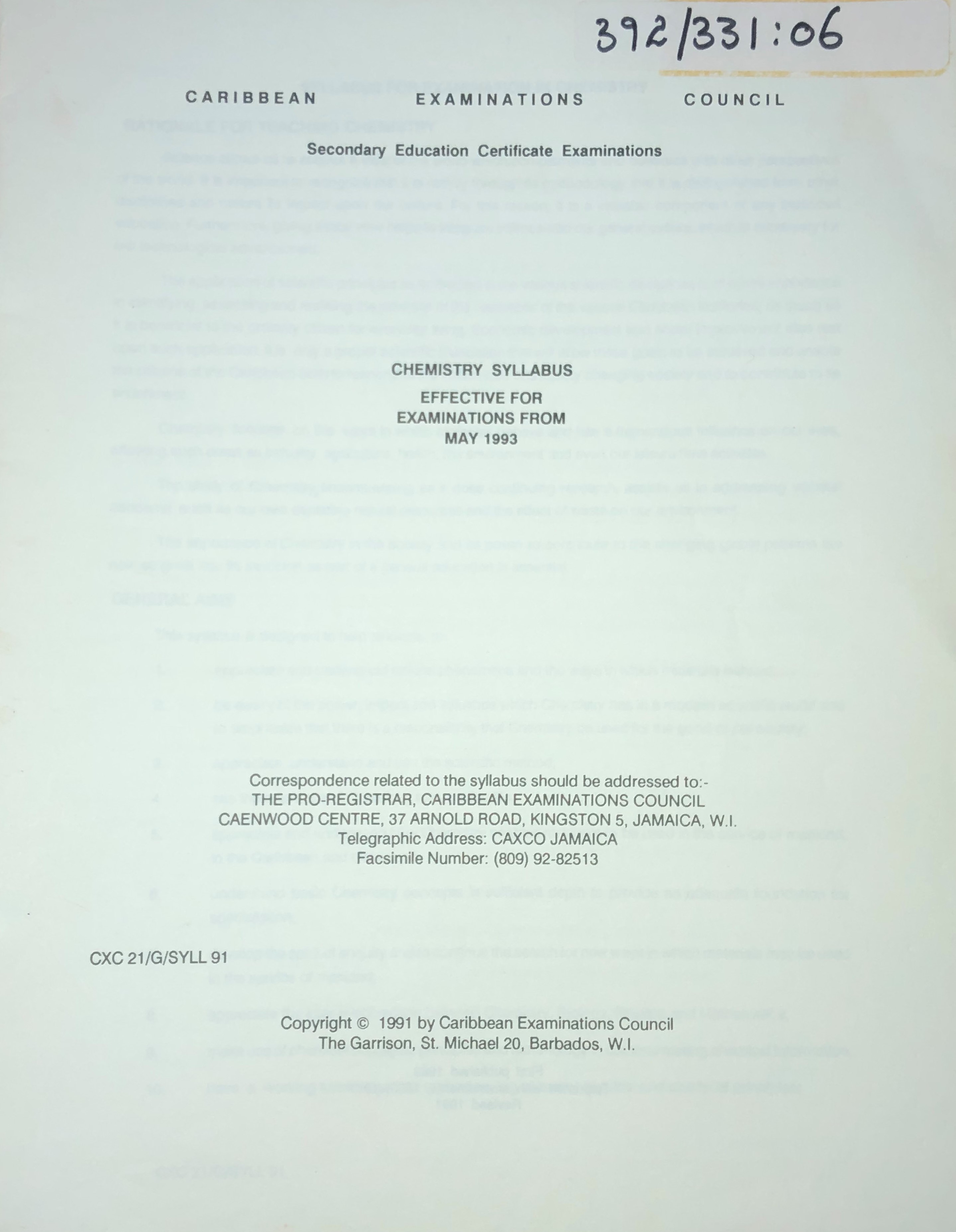 This syllabus is designed to help students to: appreciate and understand natural phenomena and the ways in which materials behave; be aware of the power, impact and influence which Chemistry has in a modern scientific world and to emphasize that there is a responsibility that Chemistry be used for the good of the society; appreciate, understand and use the scientific method; see the relevance of Chemistry to everyday life; appreciate and understand how Chemistry enables materials to be used in the service of mankind, in the Caribbean and elsewhere; understand basic Chemistry concepts in sufficient depth to provide an adequate foundation for specialisation; develop the spirit of enquiry and to continue the search for new ways in which materials may be used in the service of mankind; appreciate the inter-relationships between Chemistry, Biology, Physics and Mathematics; make use of chemical concepts, principles and terminology in communicating chemical information; have a working knowledge and understanding of basic, physical and chemical principles; contribute to making the Caribbean scientifically literate and numerate.