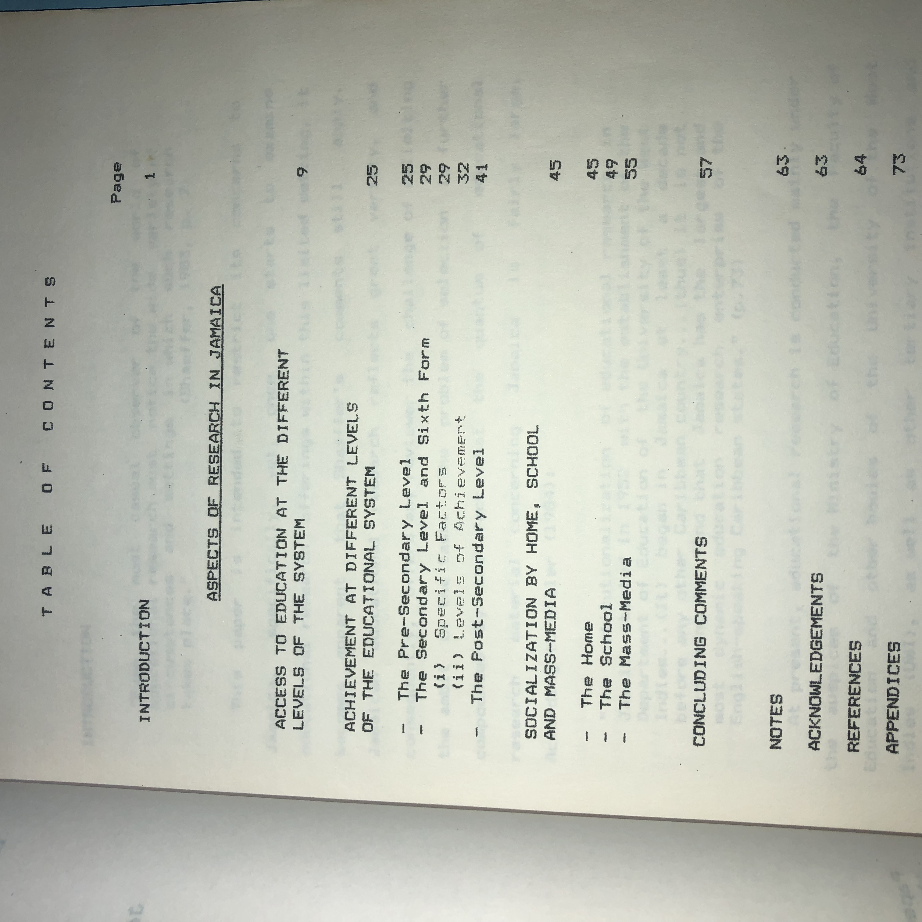 The paper reviews educational research, mainly in the formal system, during the 1970s and 1980s in Jamaica, which provides information on access to education, educational achievement and socialization.
