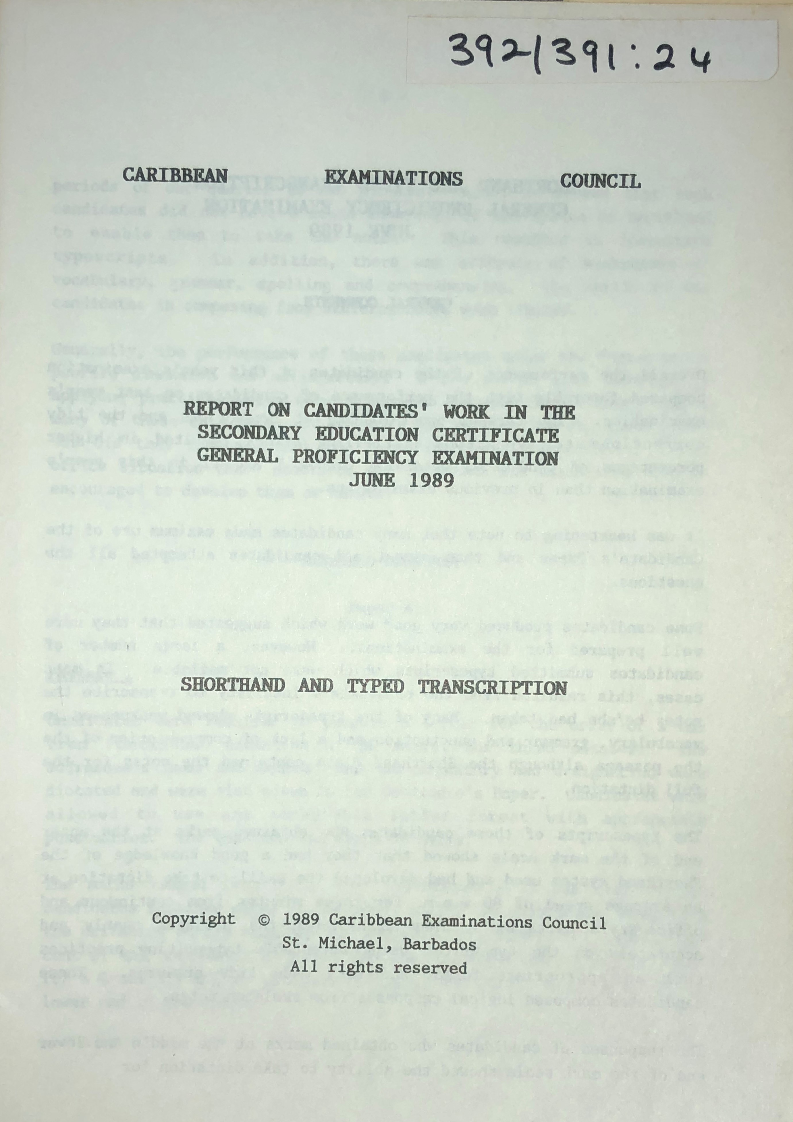 Report on Candidates' Work in the Secondary Education Certificate General Proficiency Examinations June 1989: Shorthand and Typed Transcription